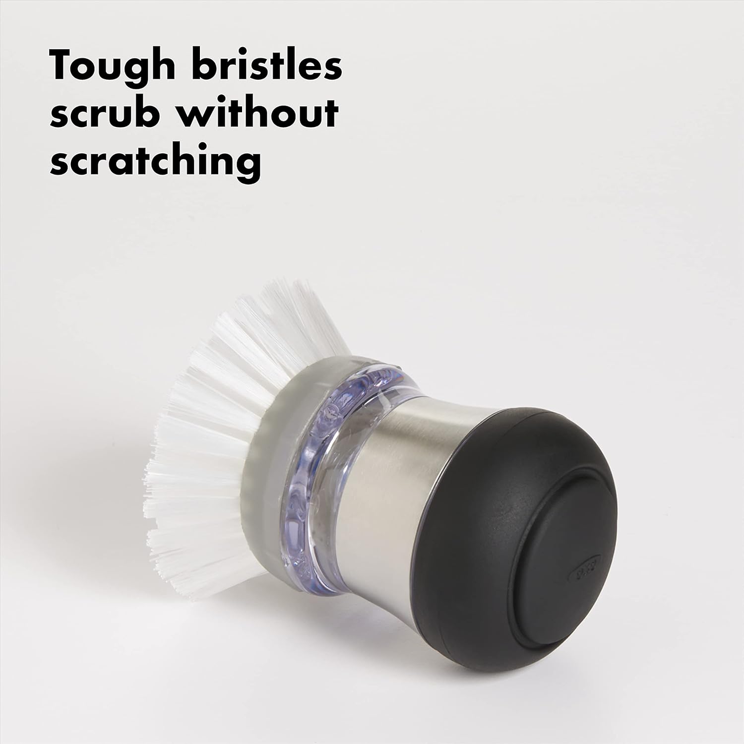 - Durable nylon bristles easily clean baked-on food and are safe for non-stick cookware