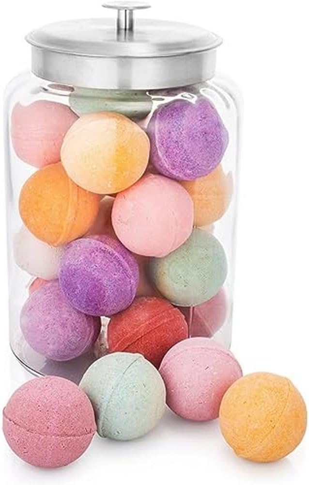 - Clear glass storage jar with airtight metal lid