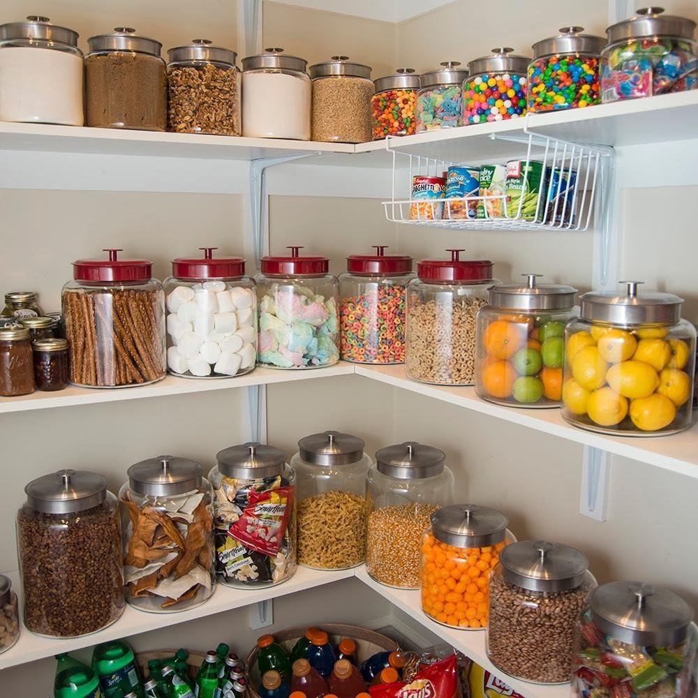 - USE: These glass jars are perfect to store and display foods in pantries and on counters. Ideal for all manner of dry goods including flour, cookies, rice, coffee, spices, candy, and much more. Silicone gasket mechanism seals lid cleanly onto glass bottom to keep air out and freshness in.