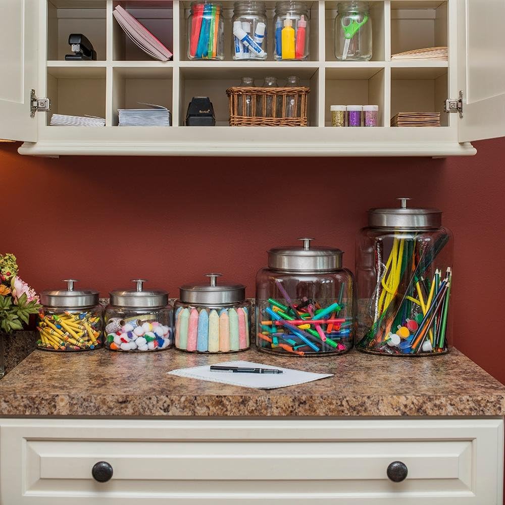- INCLUDES: This Anchor Hocking glass jar set contains (1) 2.5-gallon glass jar with (1) brushed metal lid. Has oversized knob on lid for easy gripping, an all-clear glass bottom, and substantial weight to stay sturdy on the counter.