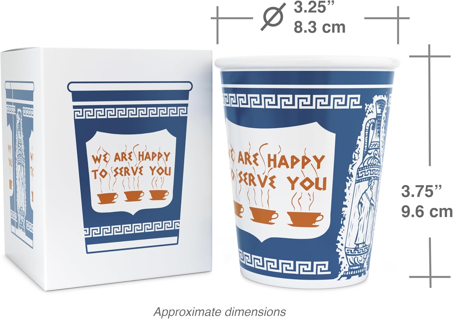- Enjoy a whimsical ceramic coffee cup in the fun, retro "We are Happy to Serve You" Greek anthora design style, just like the paper to-go cup made famous in NYC in 1963 and often portrayed in tv shows and movies.