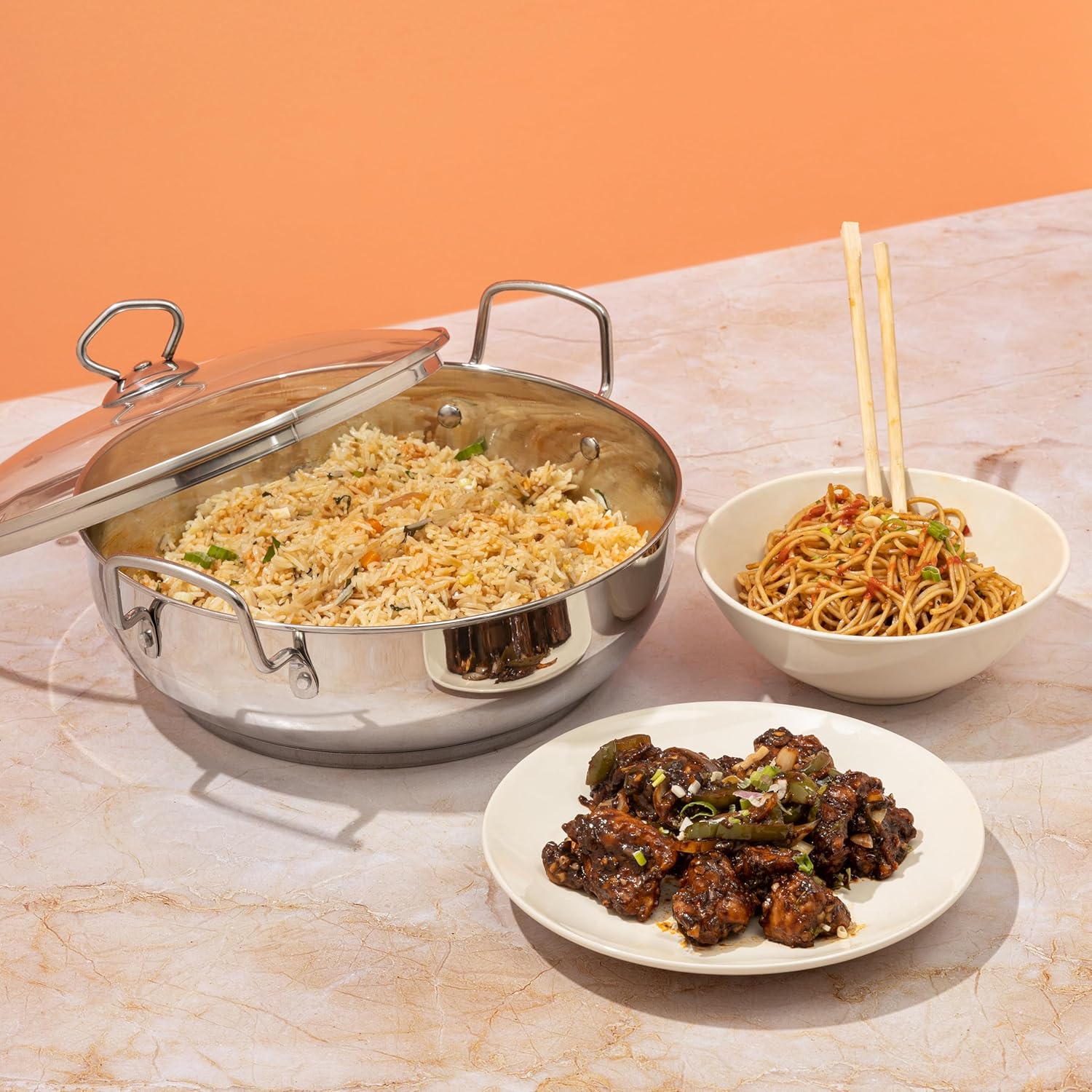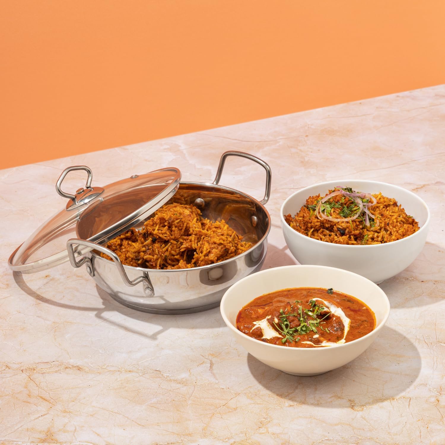 Vinod Stainless Steel Kadai with Glass Lid Extra Thick SAS Heavy Base Kadai for Cooking Induction and Gas Compatible 125 oz 10.14 in 2-Year Silver