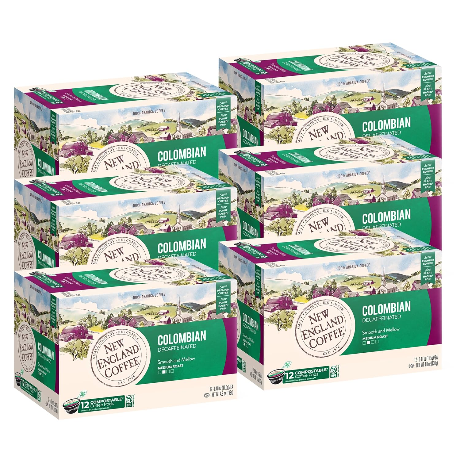 New England Coffee Colombian Decaffeinated Medium Roast Single Serve Pods, 12ct Box (Pack of 6)