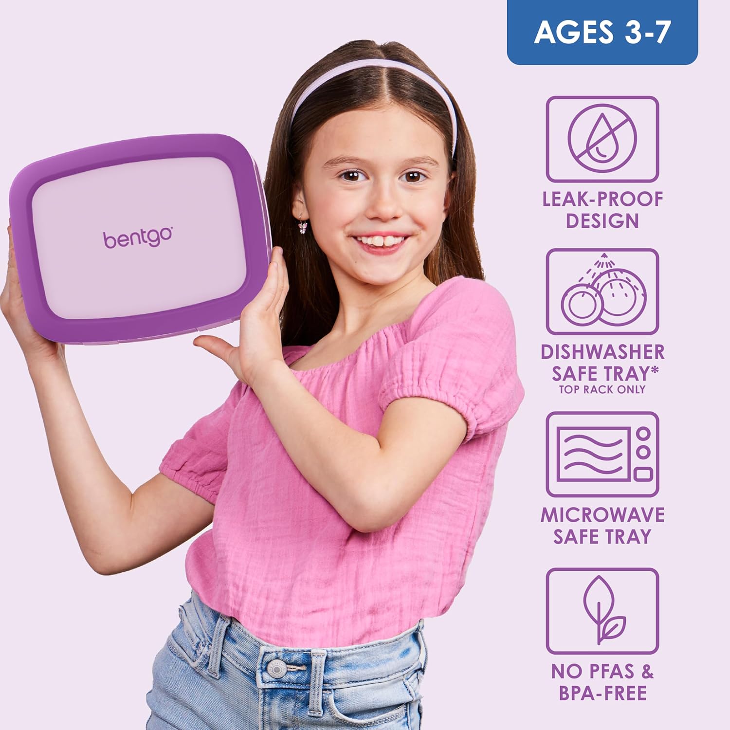 Bentgo Kids Bento-Style 5-Compartment Leak-Proof Lunch Box - Ideal Portion Sizes for Ages 3 to 7 - Durable, Drop-Proof, Dishwasher Safe, PFAS & BPA-Free & Made with Food-Safe Materials (Purple)