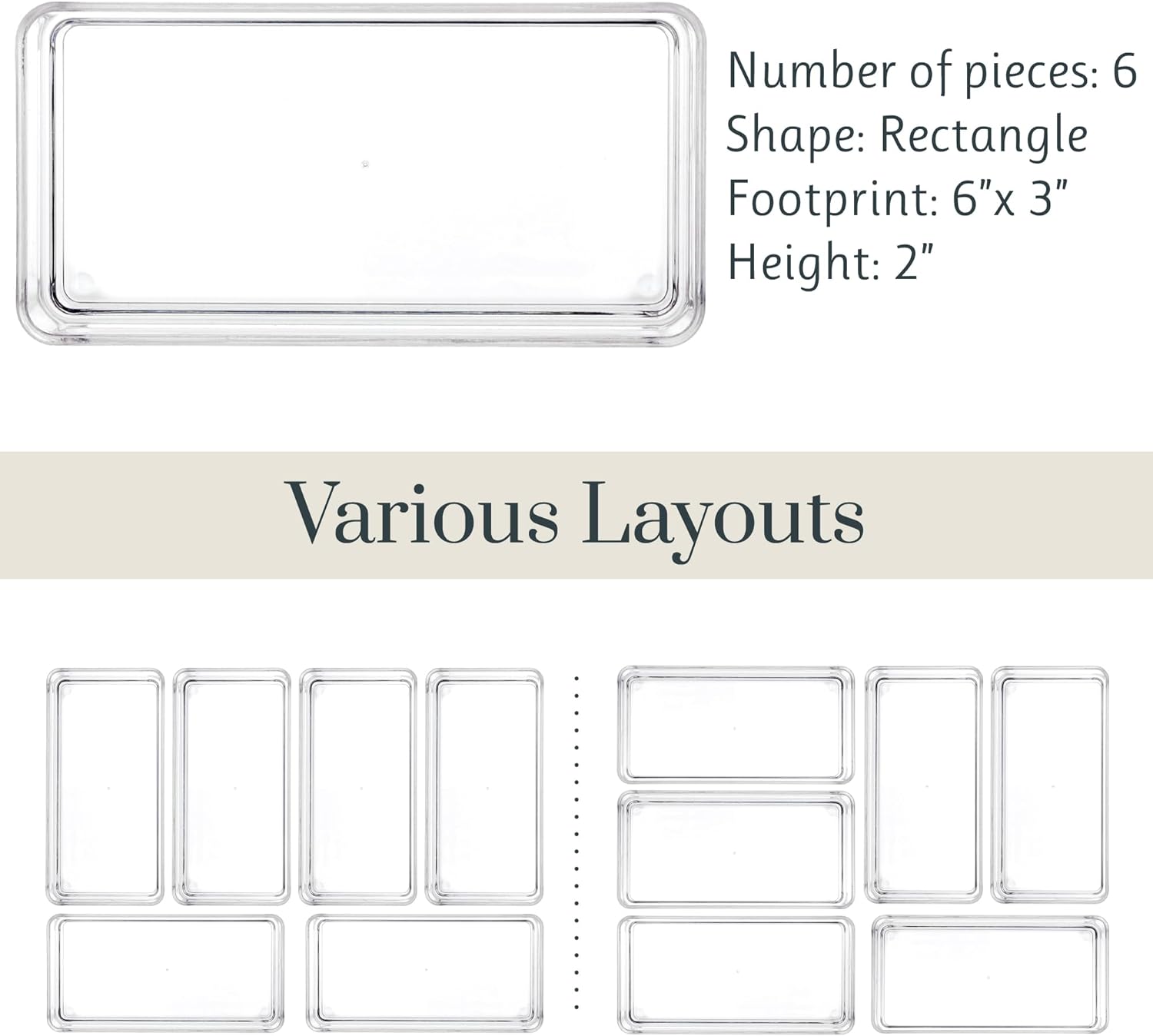 - This comprehensive set includes six meticulously crafted 6-inch by 3-inch shallow drawer organizers, designed to accommodate your essentials with precision. And with additional sizes available, you have the freedom to expand your organizational arsenal to tackle any cluttered drawer with finesse.