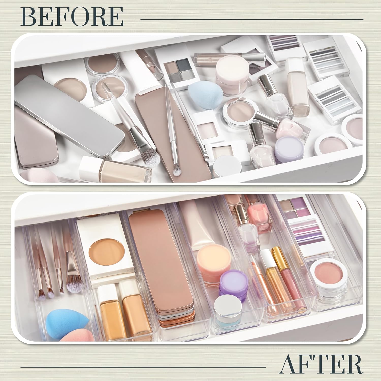 - Experience unparalleled versatility with our stackable design, perfectly suited for a myriad of items including cosmetics, jewelry, kitchen utensils, and office supplies. Say goodbye to cluttered spaces and hello to streamlined organization as these trays effortlessly maximize every inch of available space, transforming even the most chaotic drawers into orderly spaces.