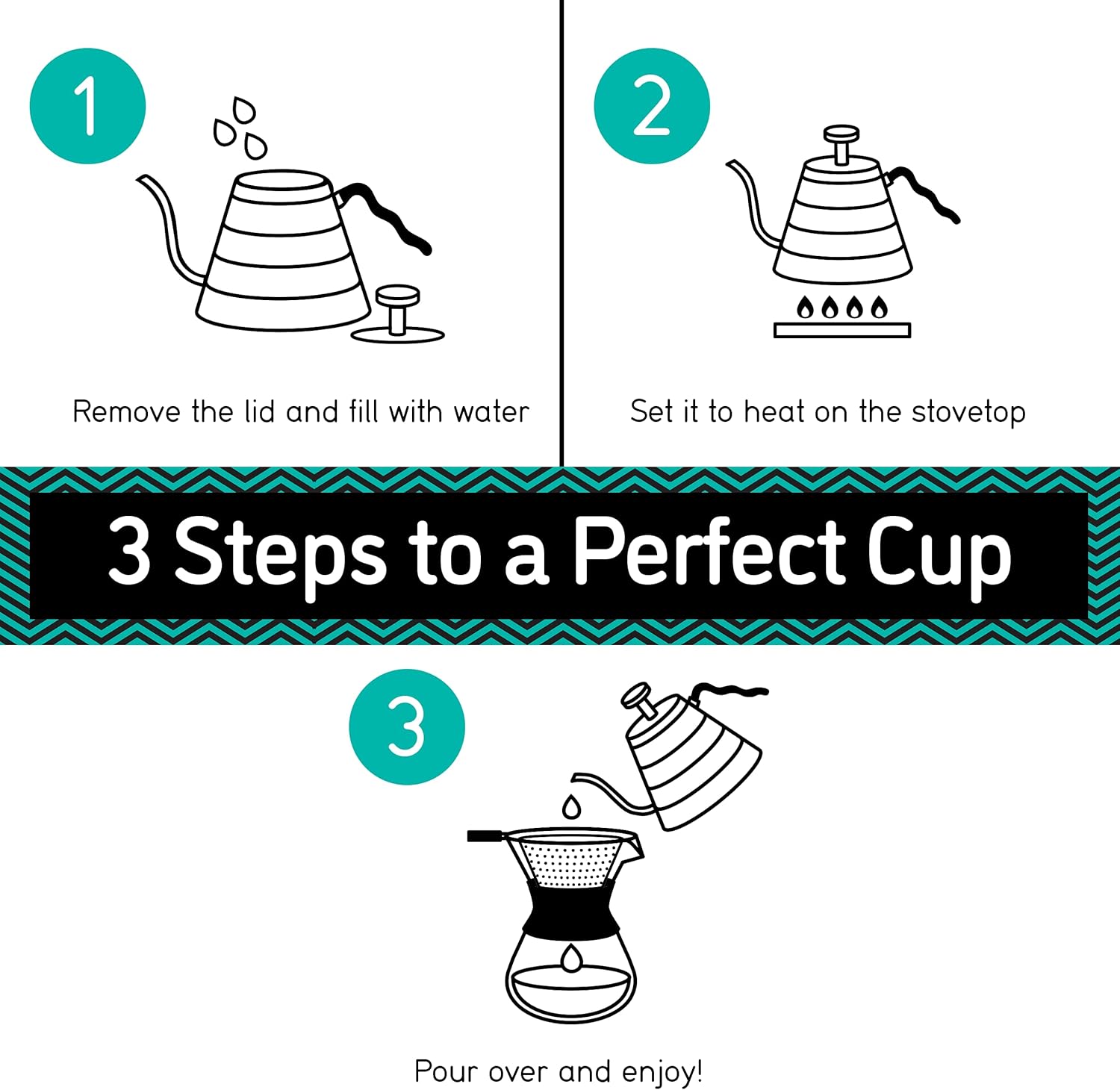• Engineered in premium-grade stainless steel with a gooseneck spout for steady water flow (essential for hand drip perfection). It’s the first gooseneck kettle stovetop with a unique triple-layer base so it works on all stovetops and stays rust-free and safe for decades