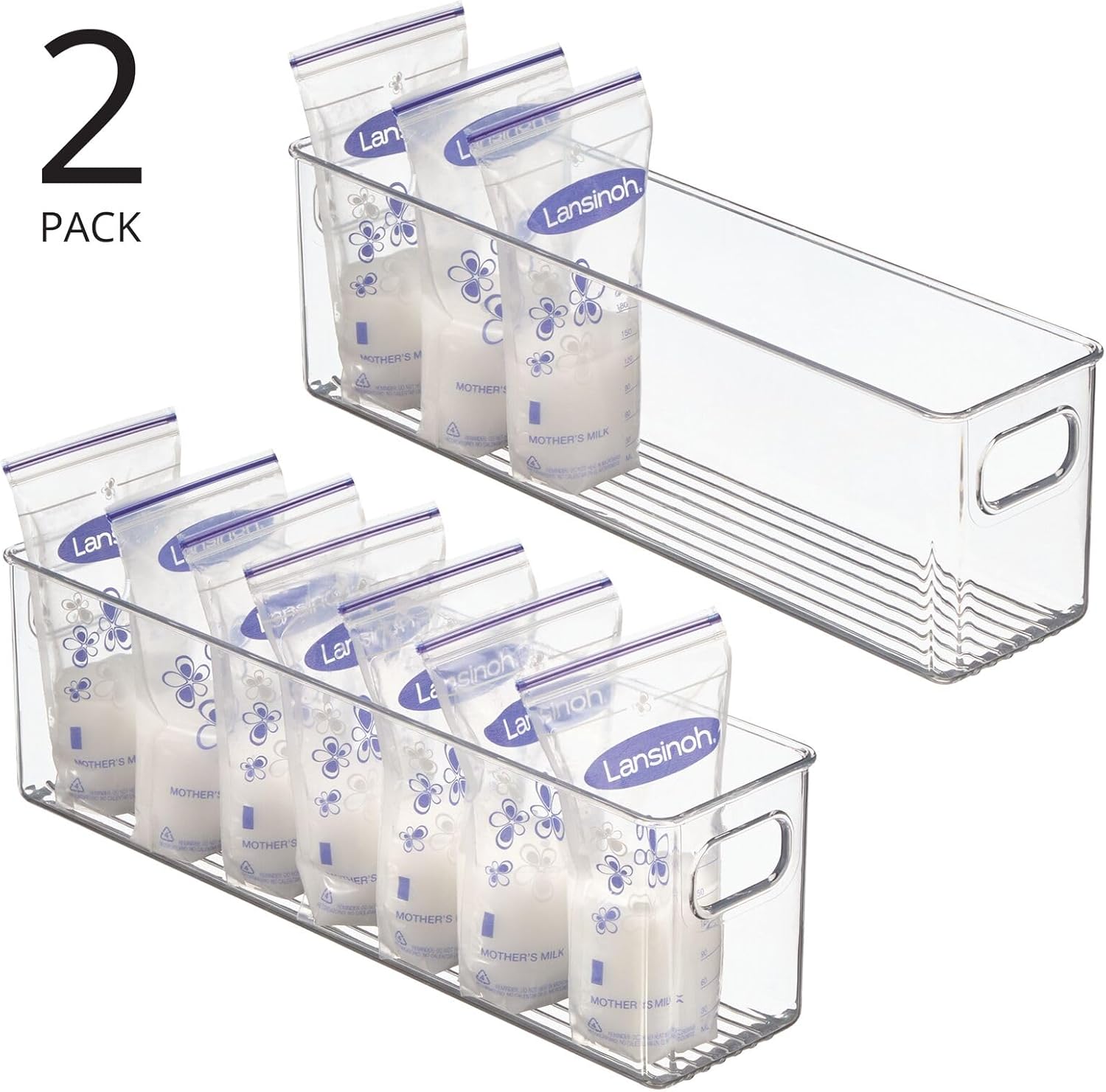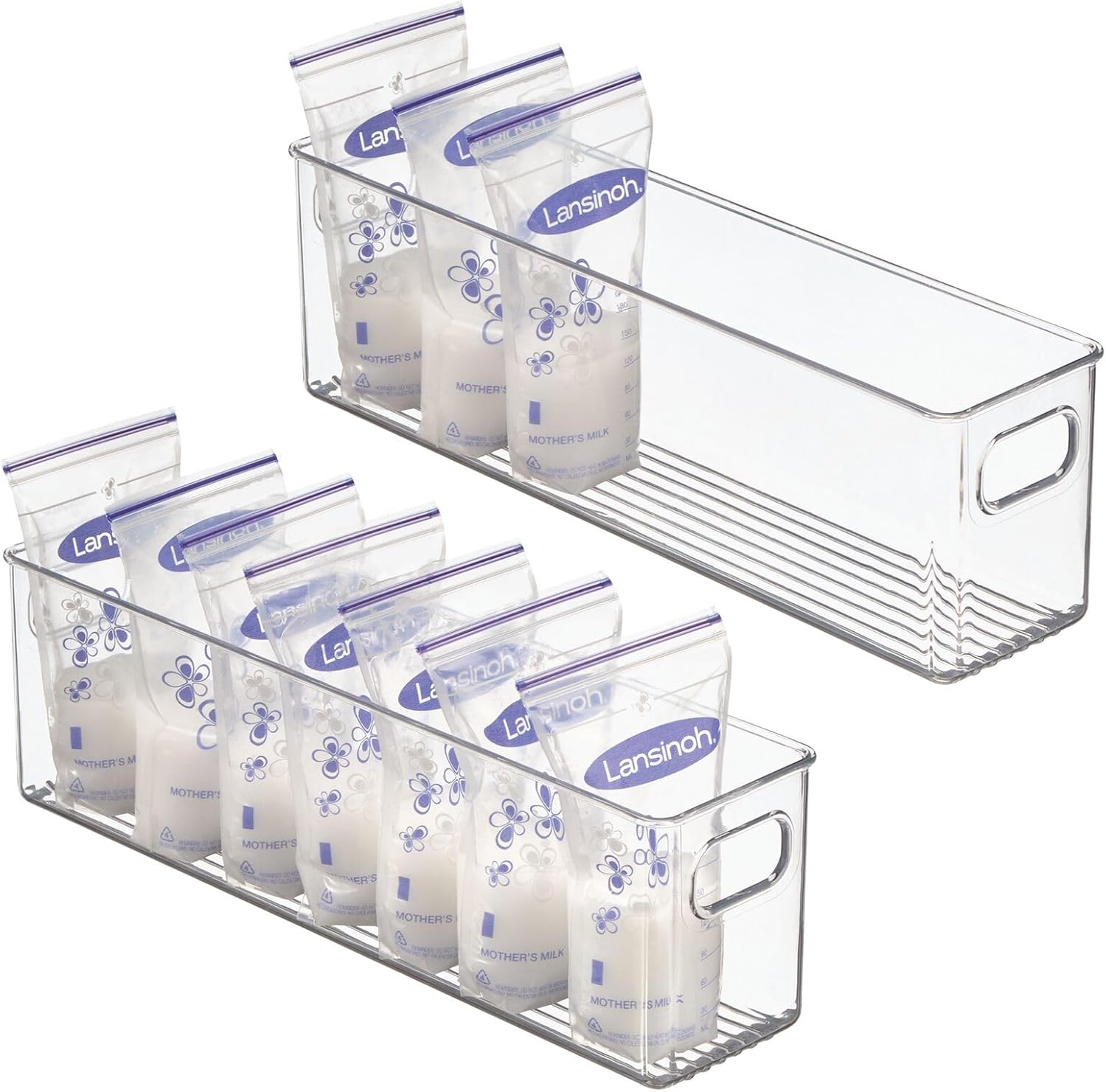mDesign Plastic Long Stackable Storage Organizer Container, Organization Bin w/Handles for Kitchen, Pantry, Fridge, Freezer, Cabinet, Perfect to Hold Breast Milk - Ligne Collection - 2 Pack, Clear