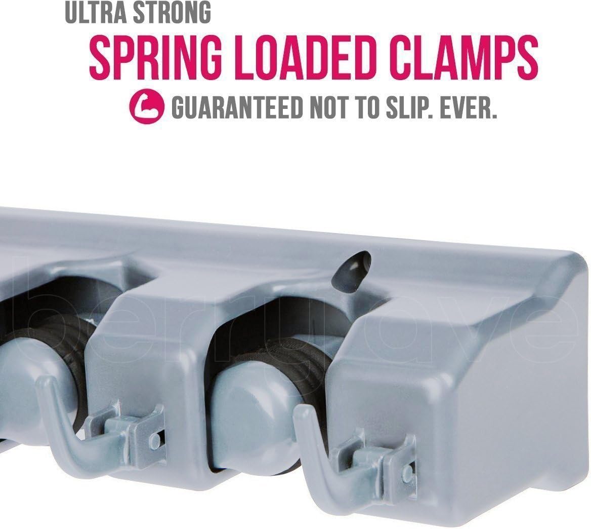 - NO SLIDE, NO MESS – Each commercial grade broom hanger has a 35 pound holding capacity. Thanks to the spring loaded, double rubber gripped slots, the Berry Ave utility hooks can hold anything from wet mops and dirty rakes to baseball bats, without any annoying slipping.