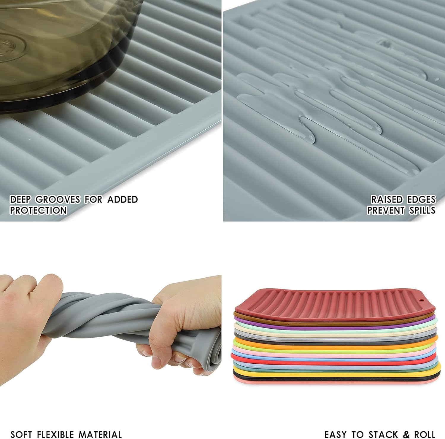 • EASY TO STORE & DURABLE - Roll up or hang on hook, simply hand-<br>wash and dishwasher safe,tested to withstand repeated twisting & <br>bending.Lifetime, no-hassle free-replacement guarantee.