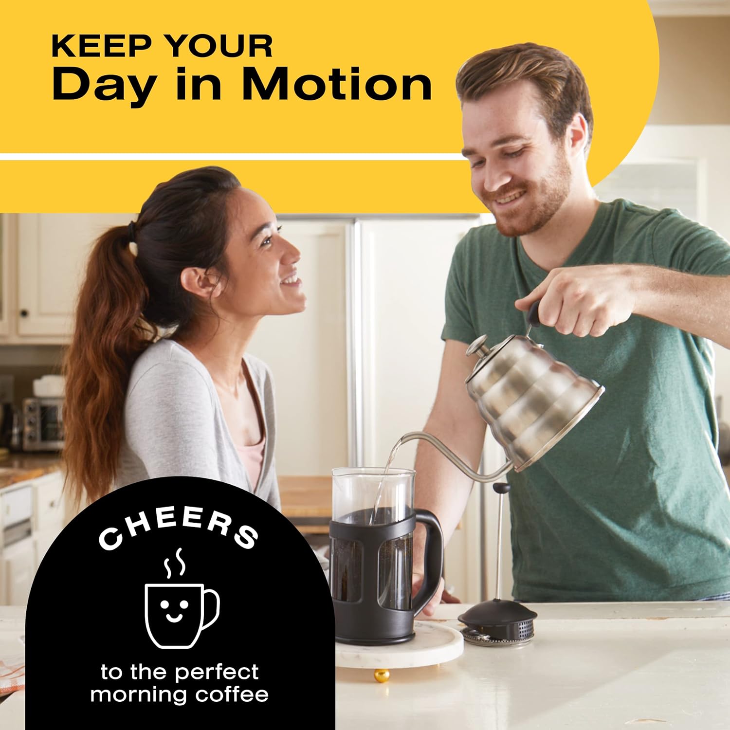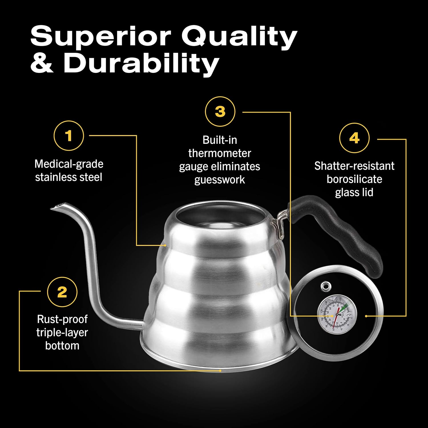 - TEMPERATURE CONTROL: Crafted with a Borosilicate glass top, built-in premium temperature gauge, and gooseneck spout, our coffee kettle eliminates guesswork - so you can enjoy every sip with a smile.