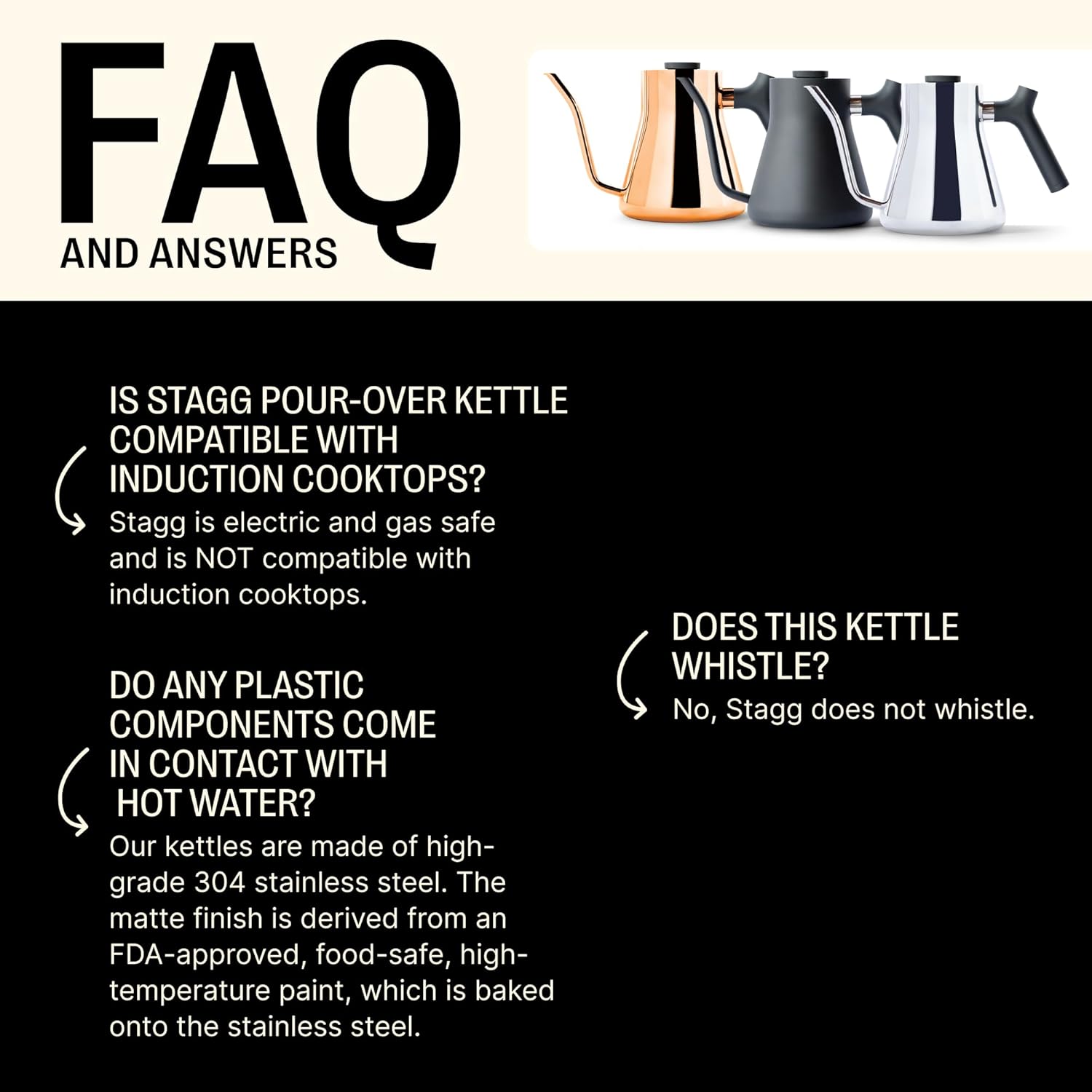 - STAGG STOVETOP POUR OVER KETTLE - A stainless steel gooseneck cooktop teapot with a beautifully functional design kicks your brewing up a notch; Make a statement in your kitchen with this matte black designer kettle. Not compatible with induction stovetops.