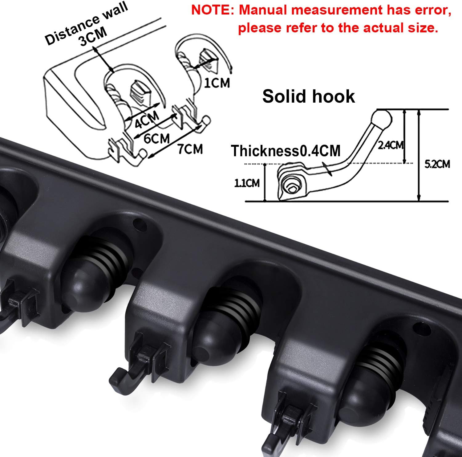 - NO-SLIDE Design Broom Organizer- 5 spring-loaded slots with rubber grips that hold tightly to tool handles to keep them firmly in place. 6 Heavy Duty hooks are movable