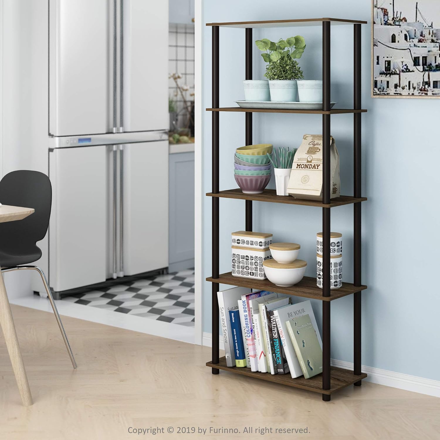Furinno TURN-N-TUBE Storage Shelves, 5-Tier Book Shelf, Corner Shelf, Toolless Open Shelves, for Organization and Storage, Living Room, Garage, Home Office, Walnut