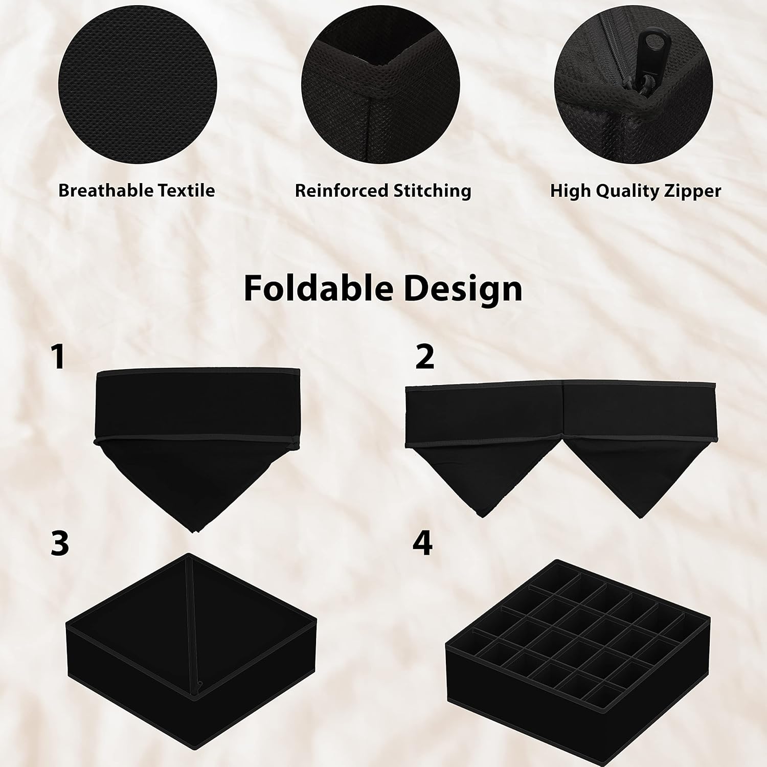 Simple Houseware 4-Pack Drawer Organizer Set - Closet Dividers for Underwear, Socks, Bras, Scarves, Ties - Foldable Non-Woven Storage Boxes, Black