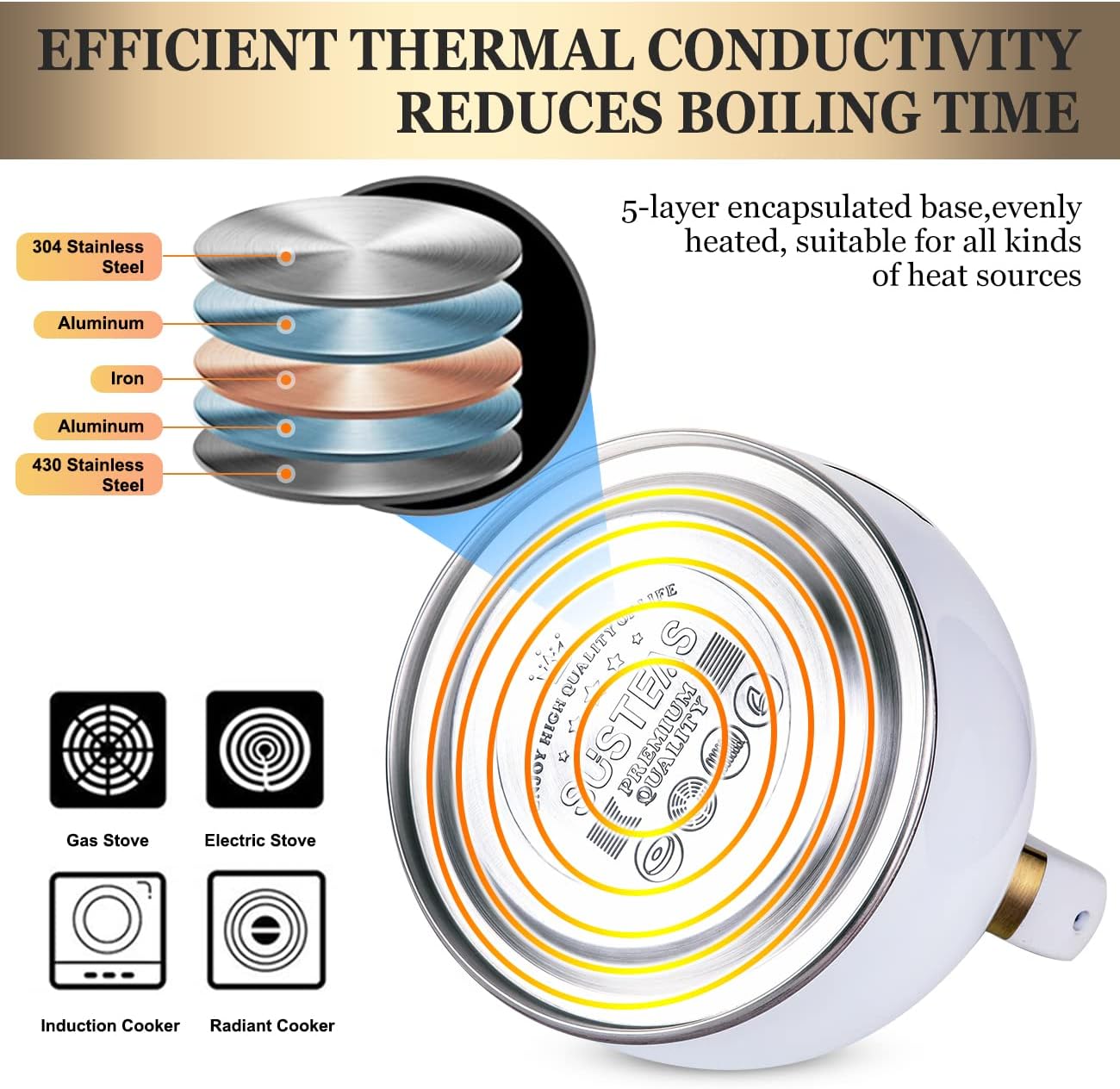 - NNOVATIVE BOTTOM BOILS WATER FASTER - SUSTEAS tea kettle is made of 5 layers encapsulated bottom, which improves heating performance while reducing heat loss, greatly shortening boiling time. It is compatible with all types of cooktops, including induction, gas, electric, halogen and radiant cooktops. You can enjoy a premium quality cup of tea or coffee at home