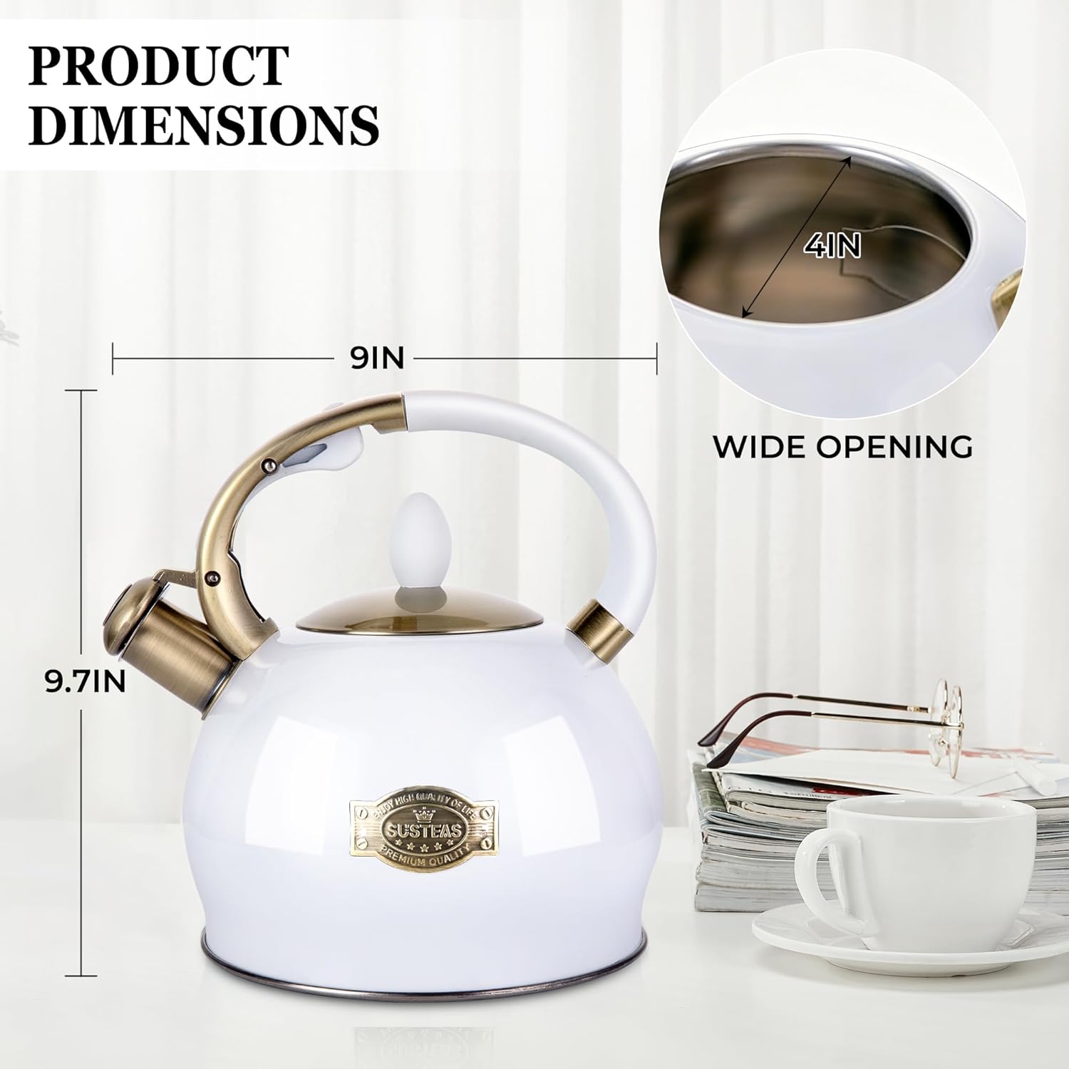 SUSTEAS Stove Top Whistling Tea Kettle - Food Grade Stainless Steel Teakettle Teapot with Cool Touch Ergonomic Handle, With 1 Silicone Pinch Mitt Included, 2.64 Quart(WHITE)