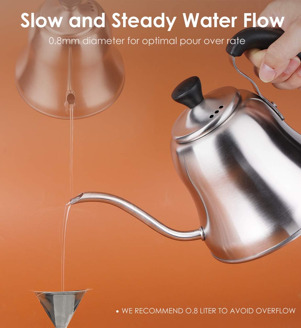 - PERFECT GOOSENECK SPOUT: Chefbar pour over coffee kettle is designed with a precise gooseneck spout nozzle to help you control the water flow. Precise and smooth water flow is essential in making drip coffee and pouring over tea. Pour the right amount of water and pour at the right speed for consistent coffee extraction.
