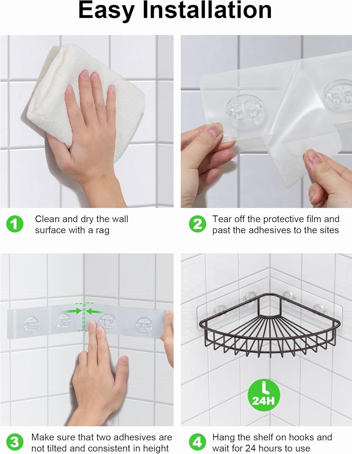 - NO DRILLING STRONG ADHESIVE: [You can refer to the video we provide to learn the installation]. Powerful adhesive comes with the bath shelf ensuring the shower rack stable, we also offer additional 2 adhesives to meet your needs, if you want to move the shower shelves to another place, just need to install adhesives. REMOVE GUIDE: Use a hairdryer to heat the sticker, tear it off easily when heat enough.