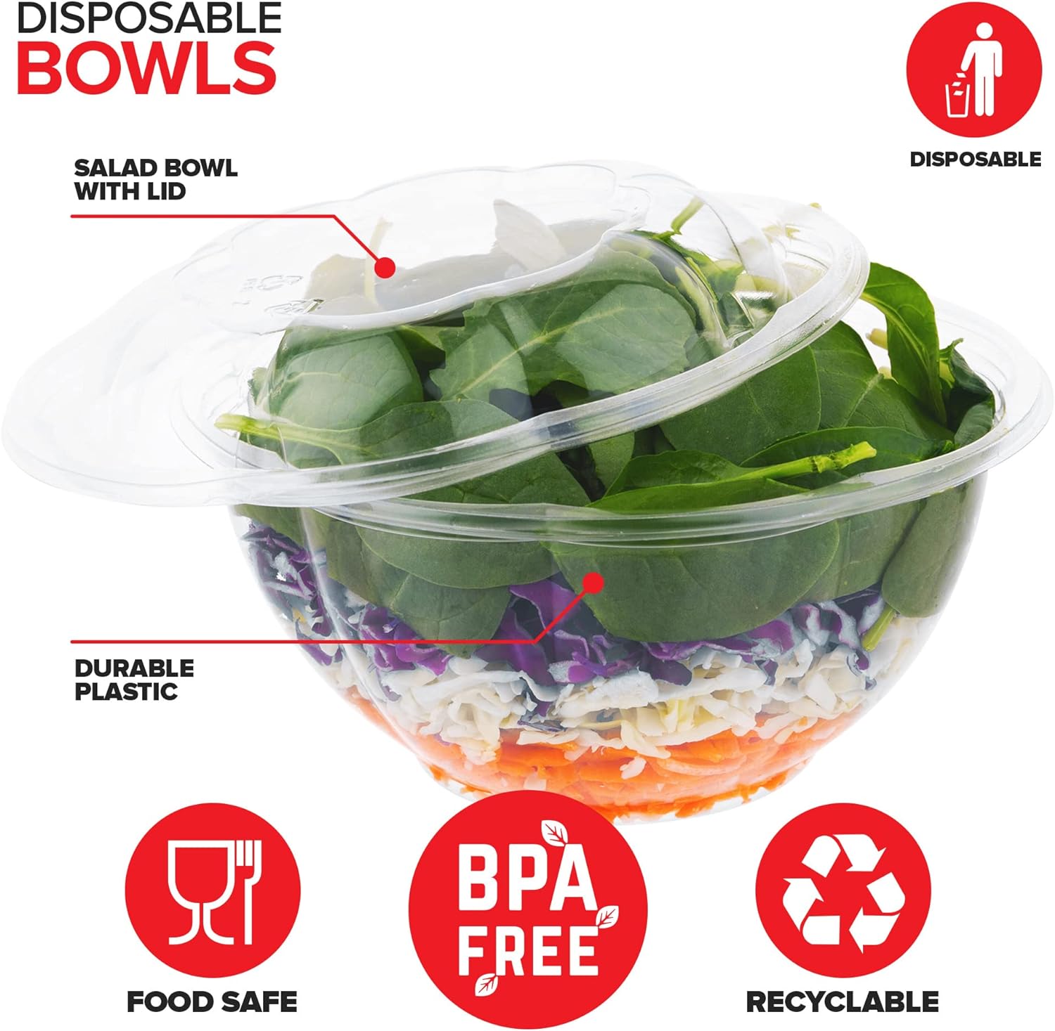 - Disposable: Made of durable plastic, our extra large salad bowls with lids are BPA-free, food safe, and recyclable. When you're done, simply toss them in the trash for easy clean-up.