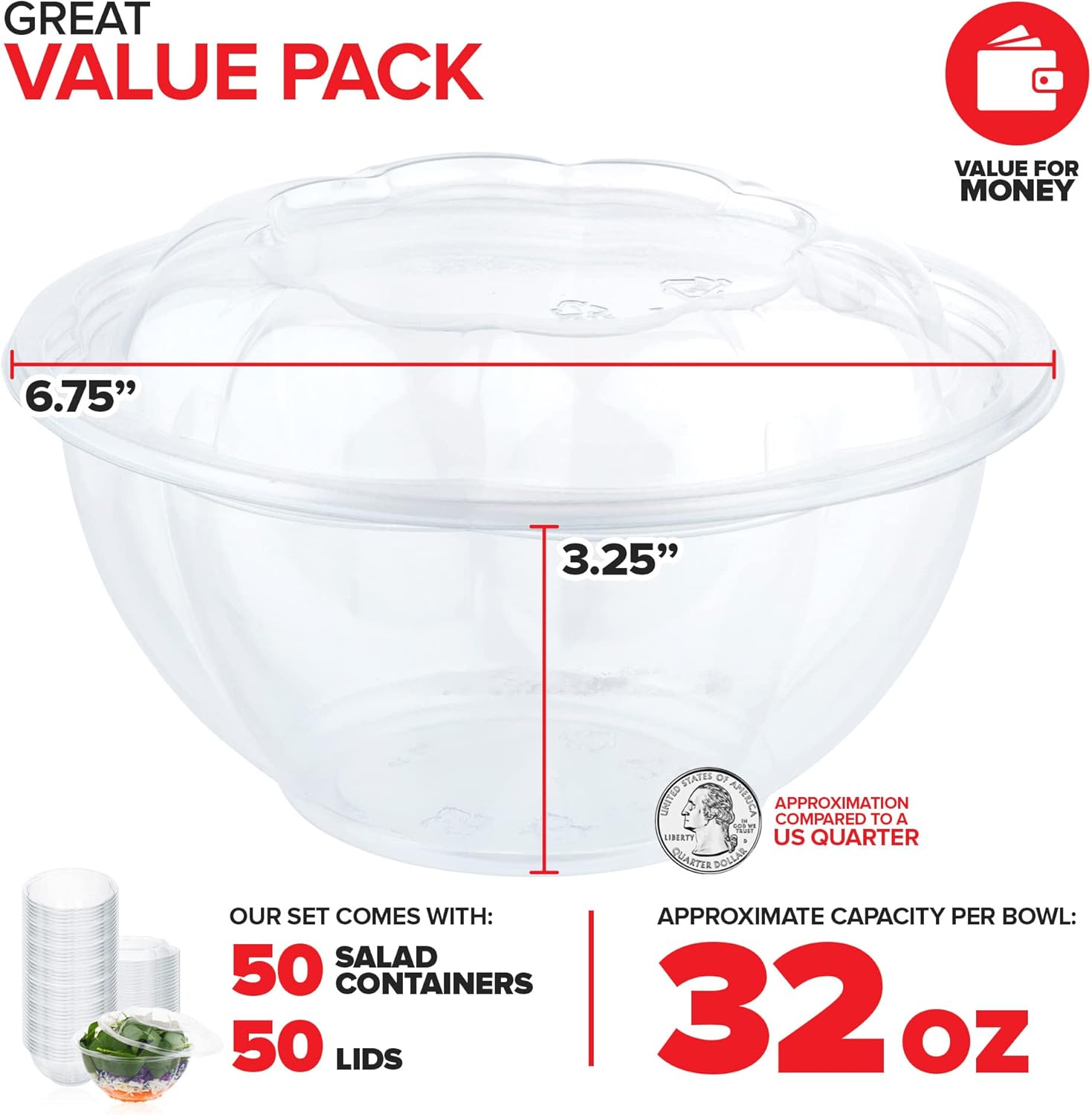 - Great Value Pack: Comes with 50 salad containers and 50 lids. Each container has a 32-ounce capacity. Measures approximately 6.75” Top Diameter x 3.25” Height.