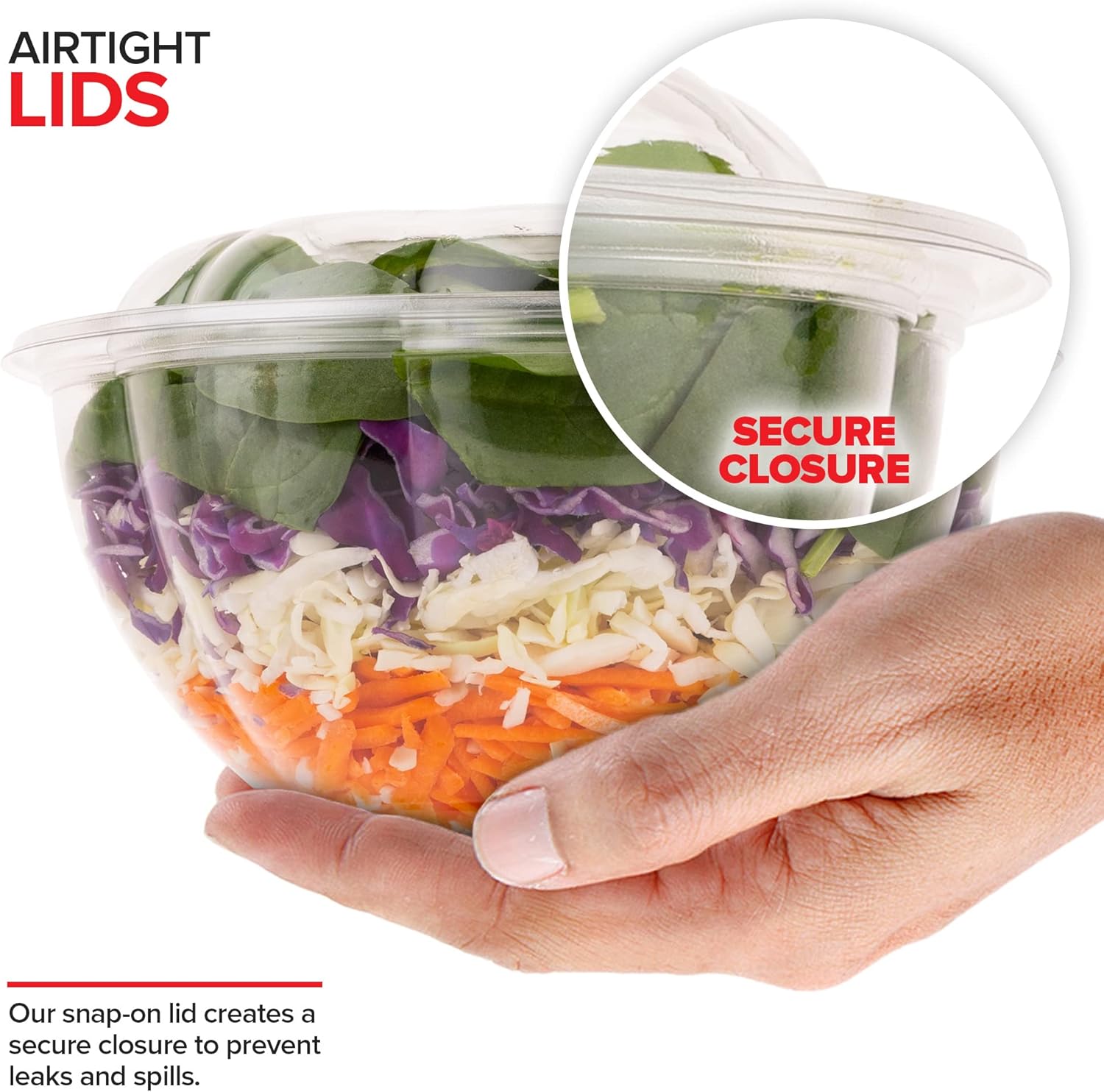 - Airtight Lids: Our snap-on lid creates a secure closure to prevent leaks and spills. This also helps keep your salads fresh and delicious!