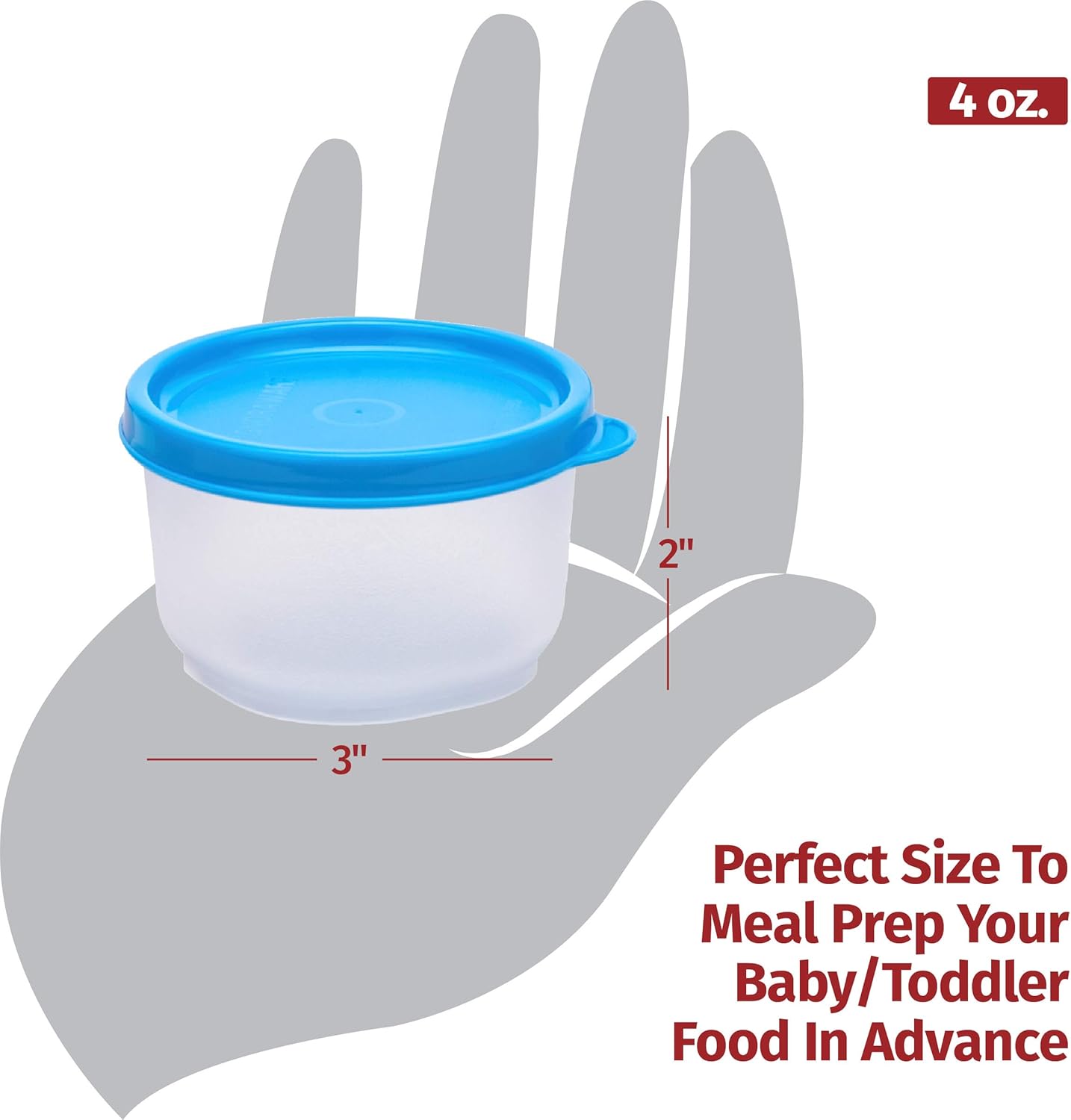- VARIOUS SIZES AVAILABLE – each set contains 6 plastic food containers with lids in 3 colors (2 lids in each color). Please select the size you require when making your purchase. Sizes available are: Nano Round 1.3 oz., Mini Mate 2.3 oz., Cute Containers 3 oz., Mini Fresh 4 oz., Handy Square 5 oz., Tiny Wonder 6.5 oz., Executive Round Med. 10 oz