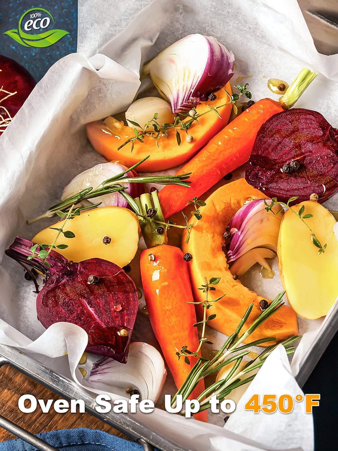 - Food Grade Baking Paper: Made of natural wood pulp, non-toxic, healthy and safe. Suitable for baking, grilling, frying, and steaming, you can use it for baking cookies, bread, meat, pizza, etc. Withstands temperatures up to 450℉, keeping your food the original flavor