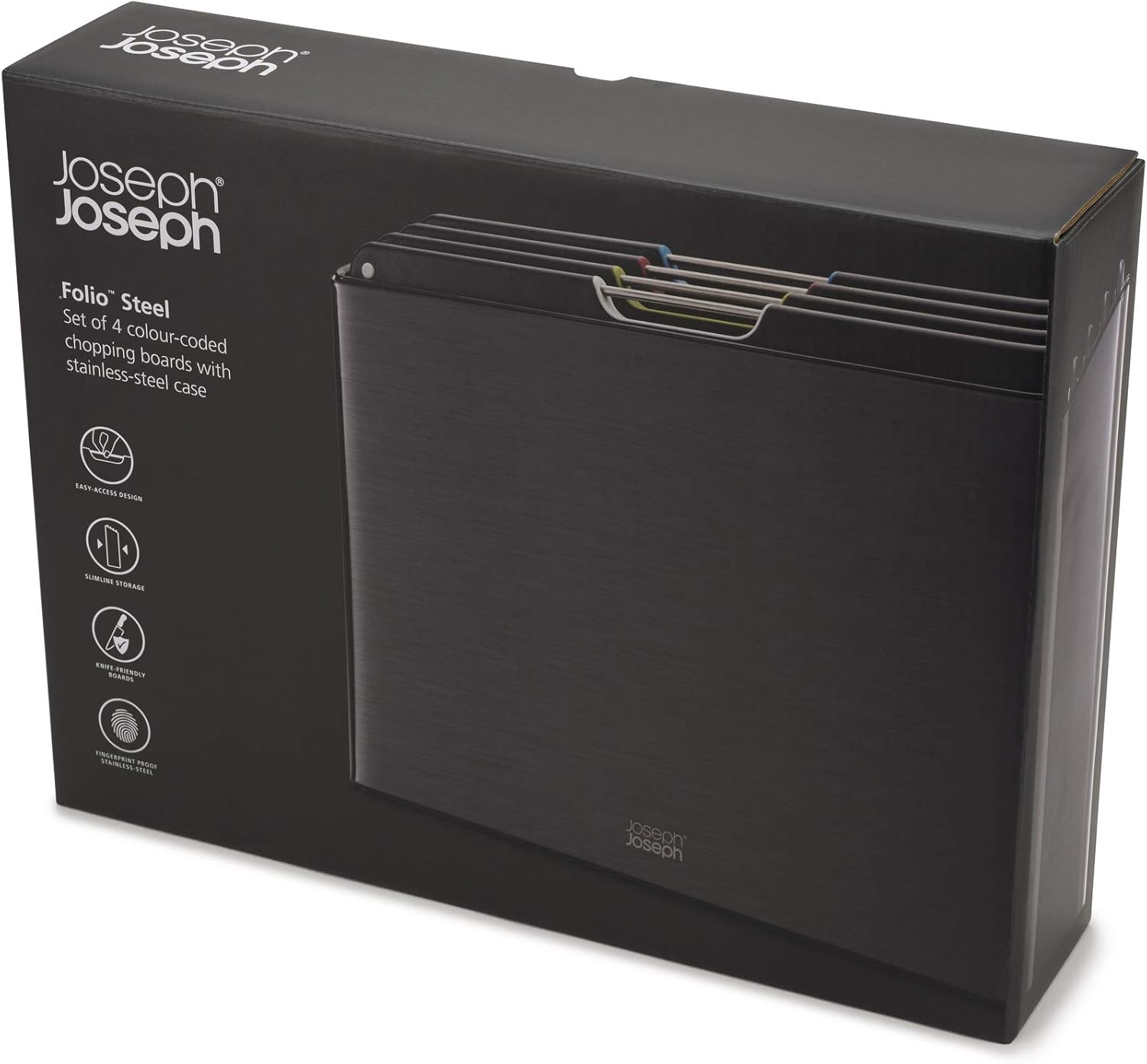 Joseph Joseph Folio 4-Piece Colour coded Cutting Board Set, Stainless Steel Slimline case for organized Kitchen storage, Black