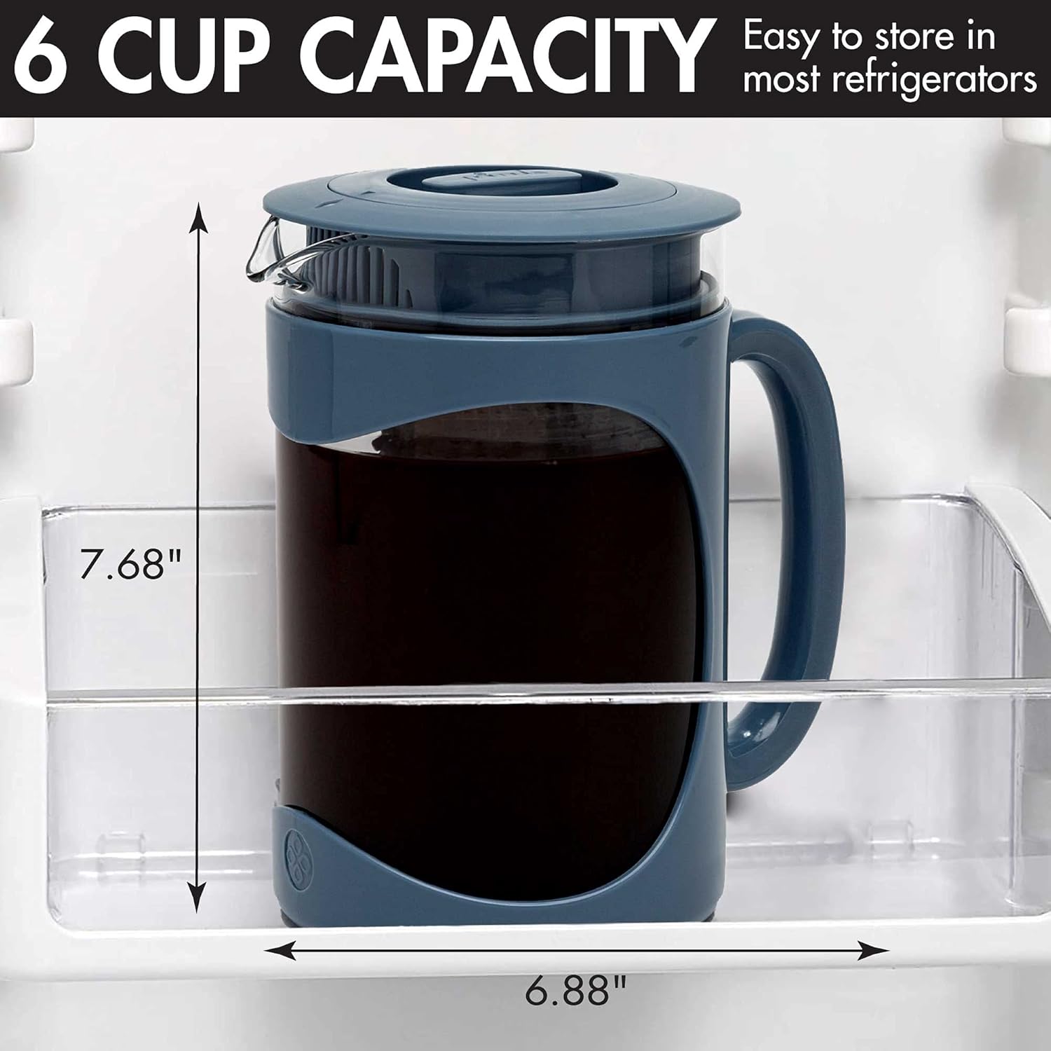- HASSLE-FREE COLD BREW- Designed to make cold brewing easy and mess-free. Easy to use, dishwasher safe, effortless cleanup, durable glass construction, removable filter, and fits most refrigerator doors or shelves. Makes up to 6 cups (52 ounces) of smooth, delicious cold brew coffee.