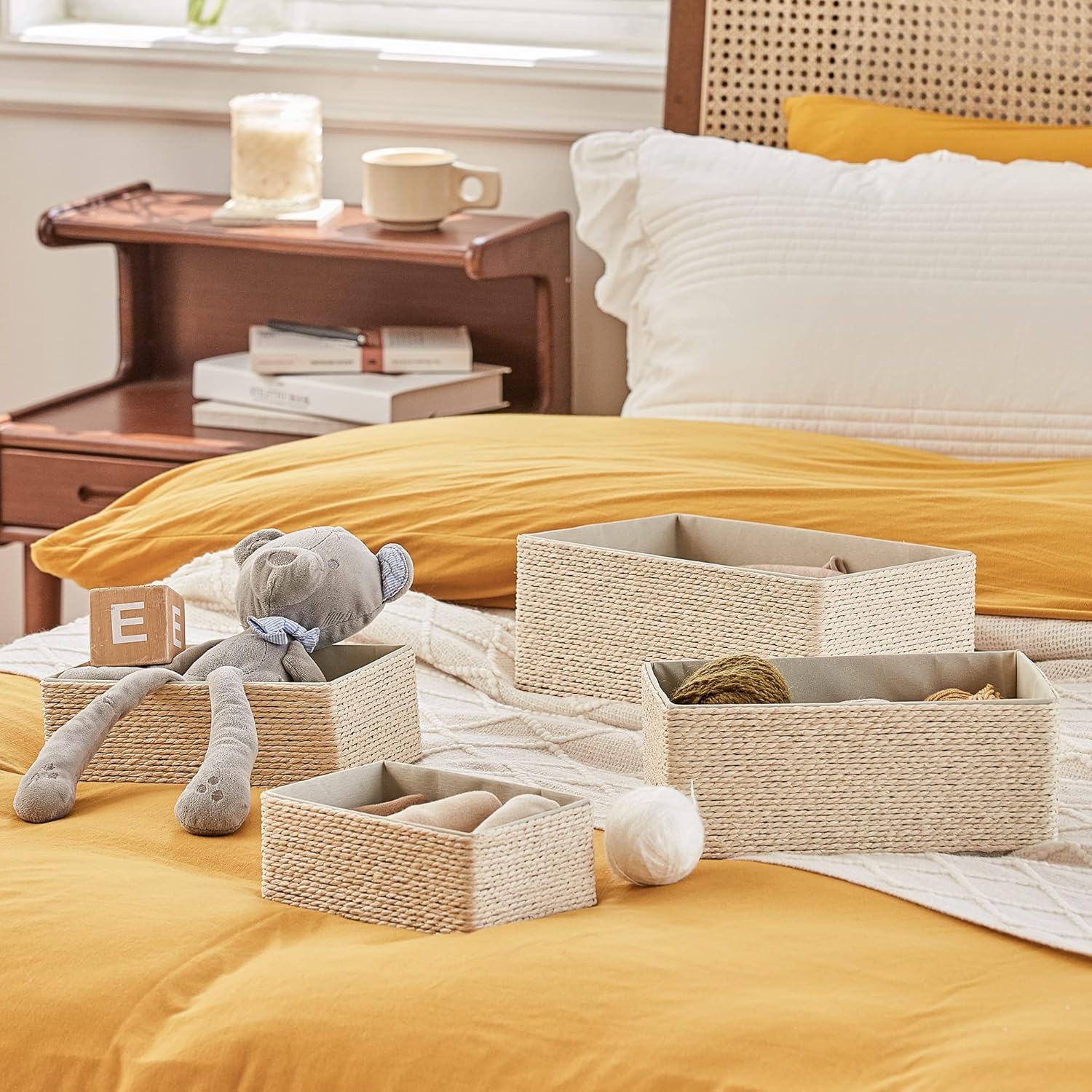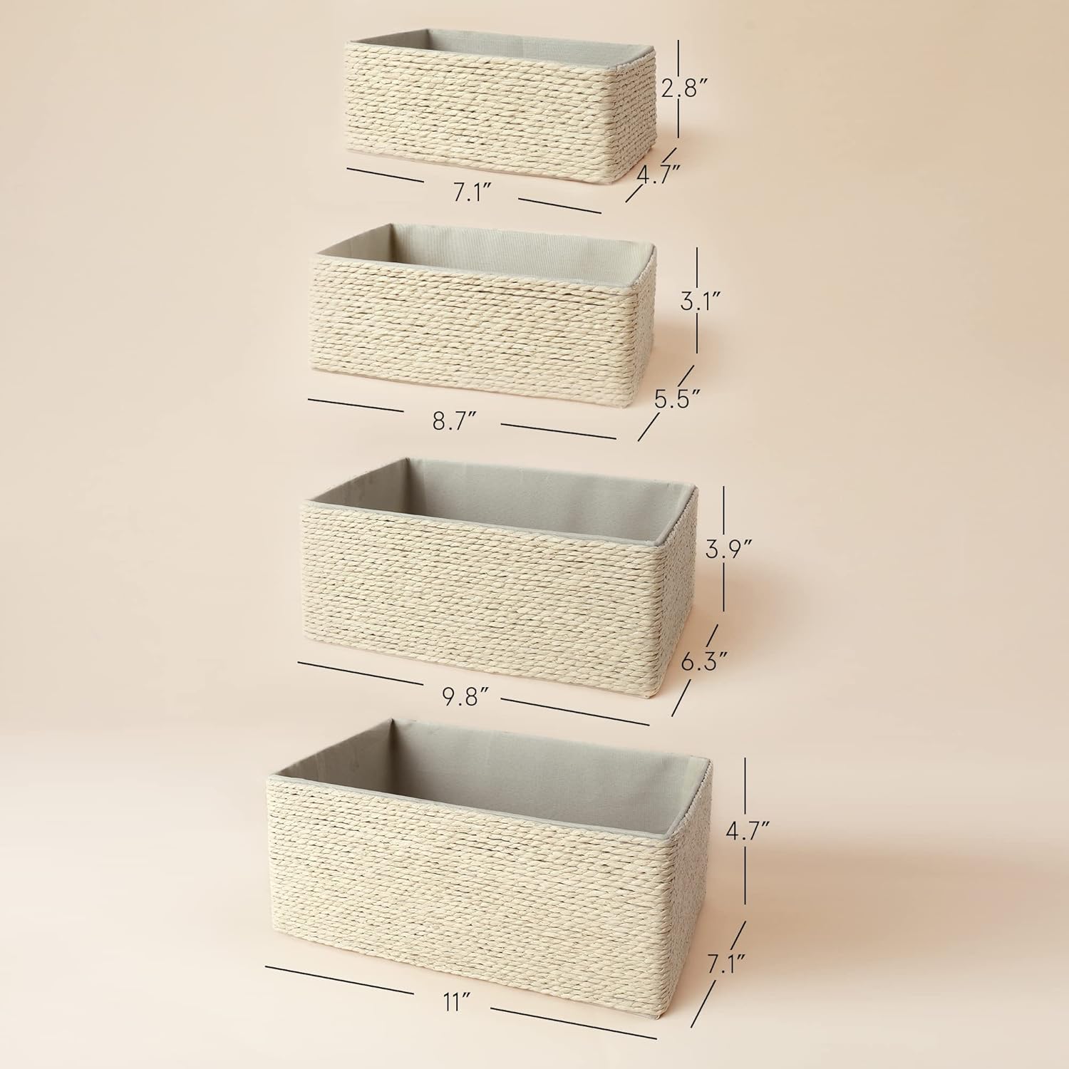 Storage Baskets Set 4 - Stackable Woven Basket Paper Rope Bin, Storage Boxes for Makeup Closet Bathroom Bedroom (Beige)