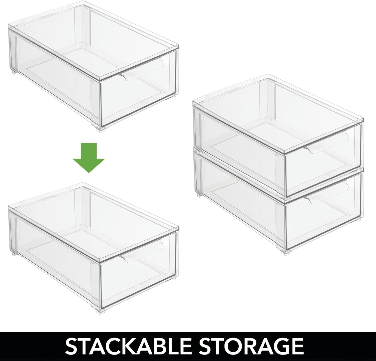 - STACKABLE: The pull-out drawer opens easily, making it simple to grab what you need quickly; The bin's clear construction lets you see what's inside, so you can easily find what you're looking for; The stackable design lets you maximize space by creating vertical storage; Use individually or together to create a custom storage system that works for you; Keep bathroom items contained, organized, and dust-free; mDESIGN TIP: Stack them vertically to maximize your storage potential-Stack and Store!