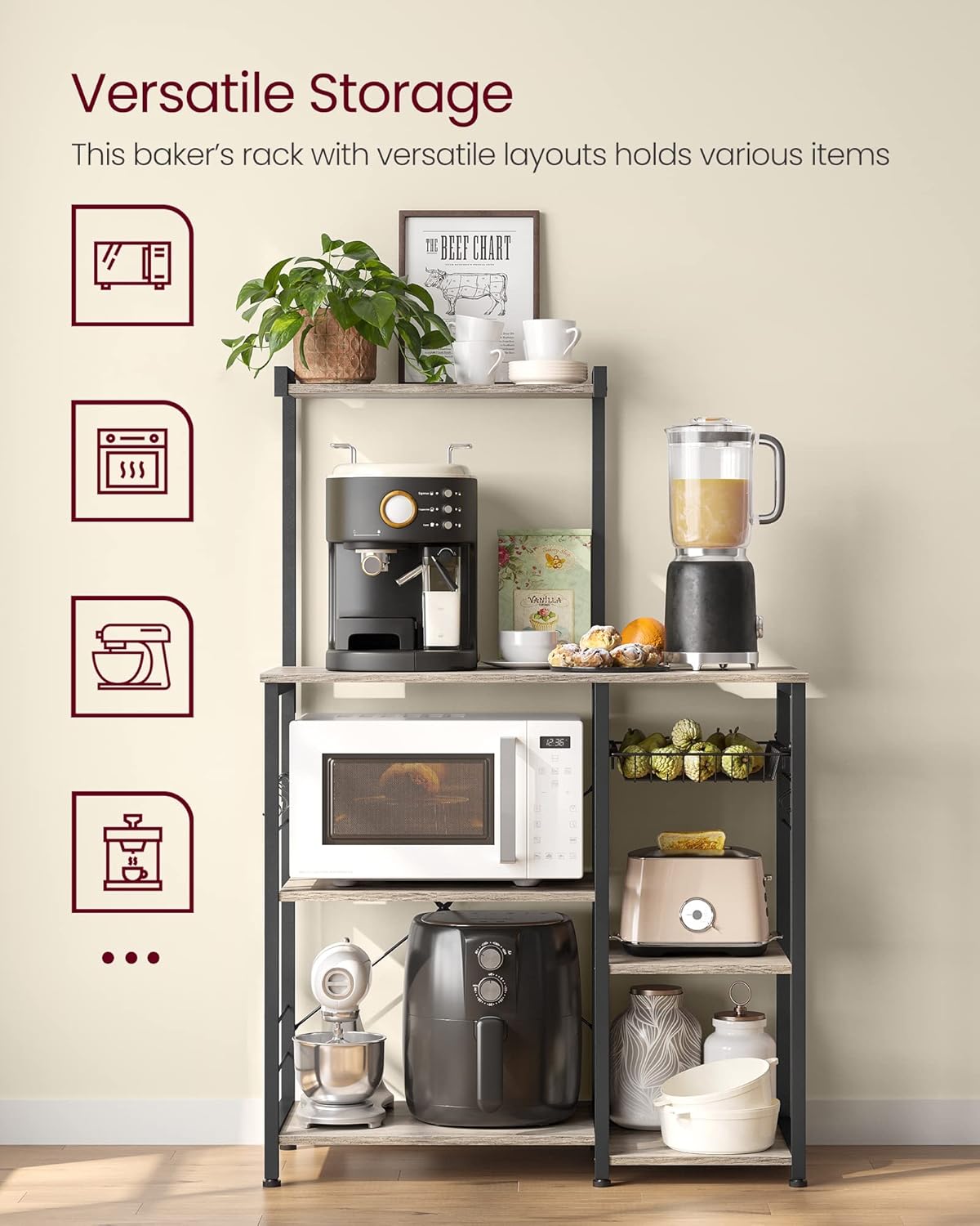 VASAGLE Baker's Rack, Microwave Stand, Kitchen Storage Rack with Wire Basket, 6 Hooks, and Shelves, for Spices, Pots, and Pans, Heather Greige and Ink Black UKKS035B02