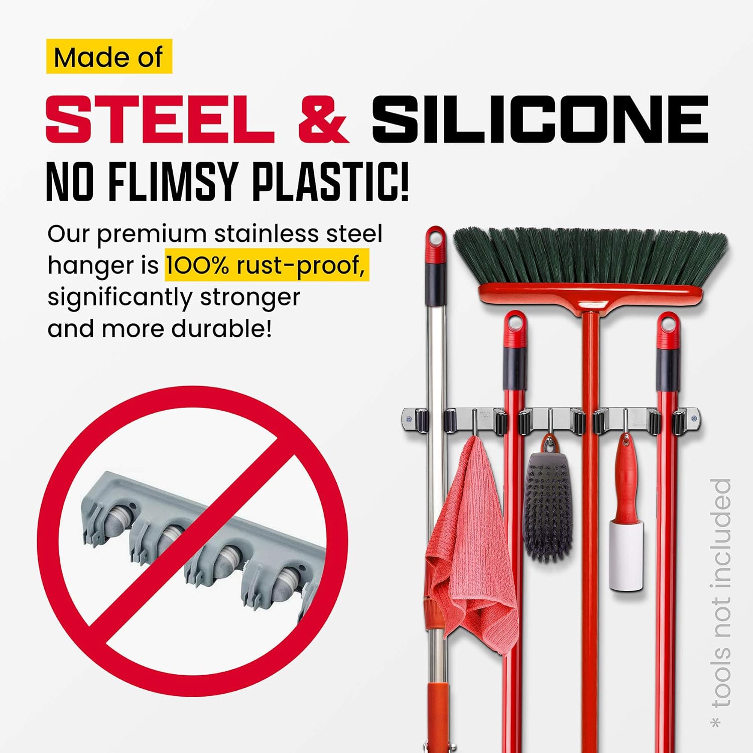 - SWEEPS THE COMPETITION – Most organizers cut corners with weak plastic materials that break and drop. That’s why our broom holder for garage boast stainless steel frames and strong silicone clamps for a superior hold!
