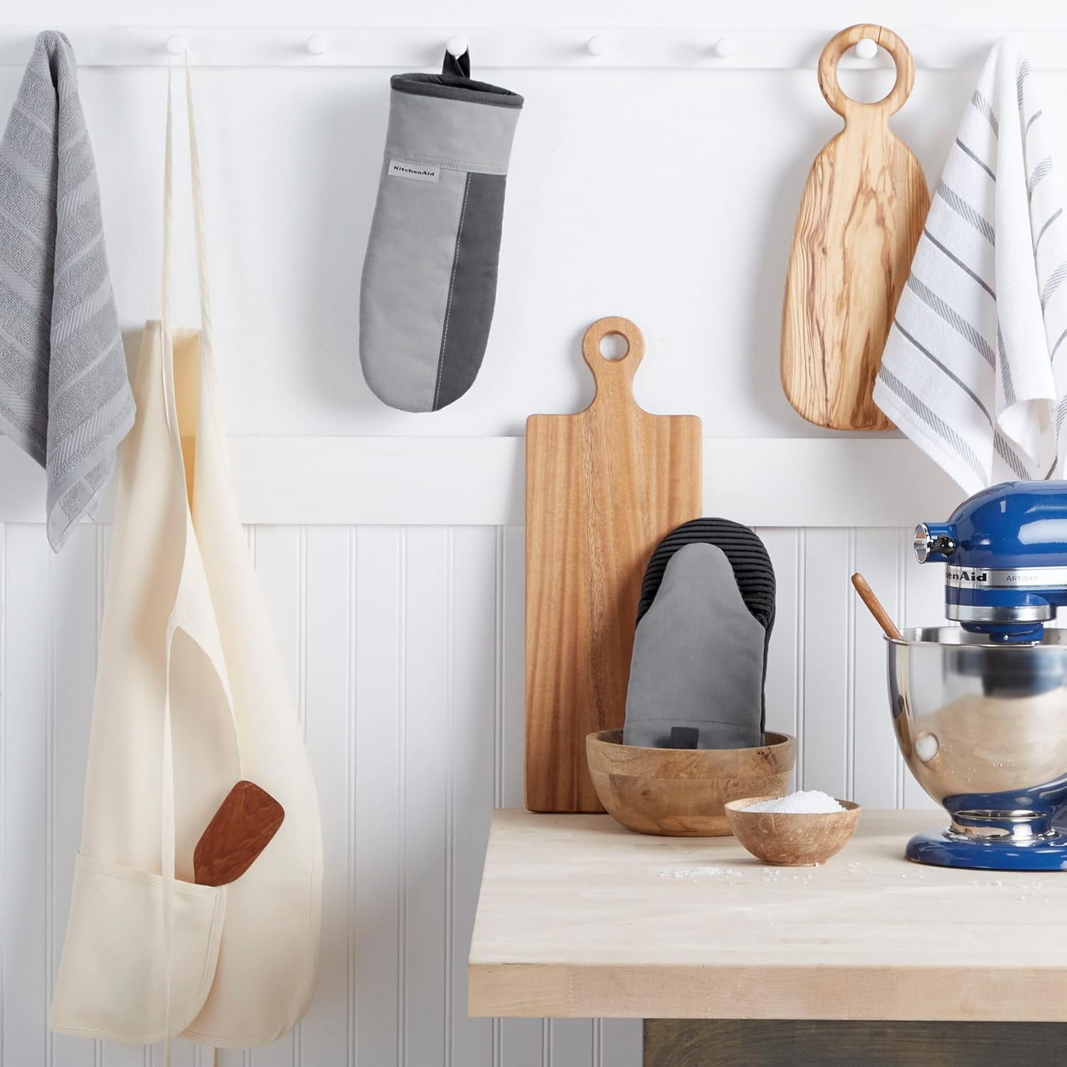 - SET OF TWO – Safeguard your hands while handling hot cookware with these mitts. Set includes two (2) generously sized KitchenAid Beacon Mini Mitts, each measuring 5.75" W x 13" L.