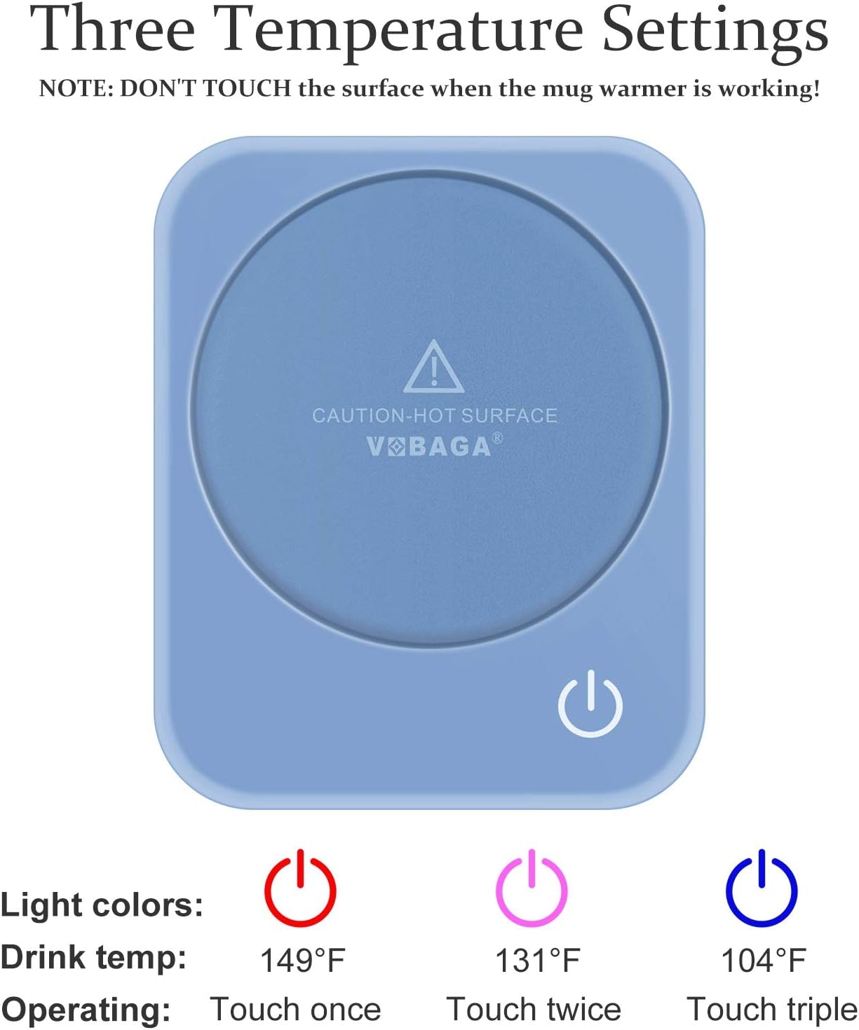 - Adjustable Three-Temperature Setting: VOBAGA coffee warmer will keep your coffee at a perfect drinking temperature. You can control the temperature by tapping the button, keeping your coffee or milk up to 104℉-131℉-149℉ (40℃-55℃-65℃). Changing temperature is just a tap on of your finger.