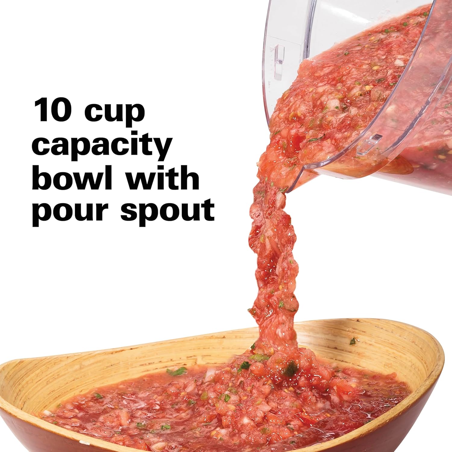 - LARGE 10 CUP BOWL WITH POUR SPOUT. You’ll be able to process 10 cups of food without having to stop to empty the bowl. Since the bowl has a pour spout, you can transfer dressings, sauces and purees into serving or storage containers without making a mess.
