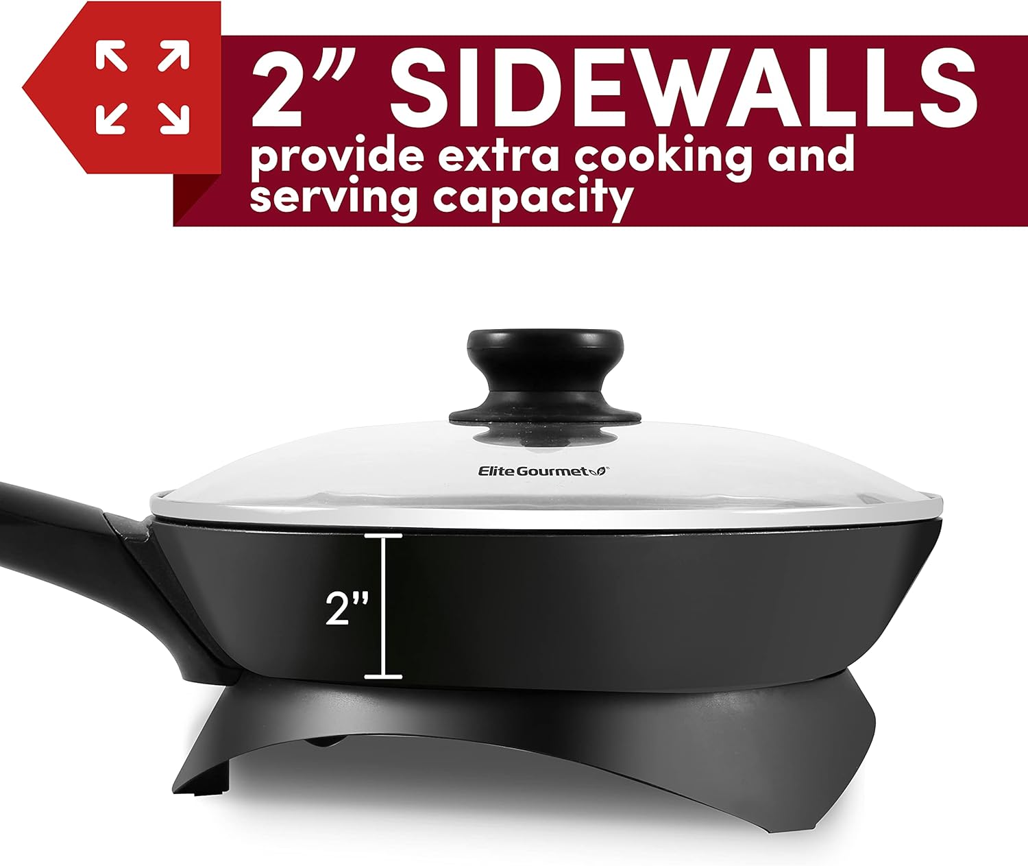 Elite Gourmet EG6207 Scratch Resistant 10.5-inch (2Qt) Fry Pan, Easy-Pour Spout Dishwasher Safe, Non-stick Electric Skillet with Glass Vented Lid, Adjustable Temperature, Black