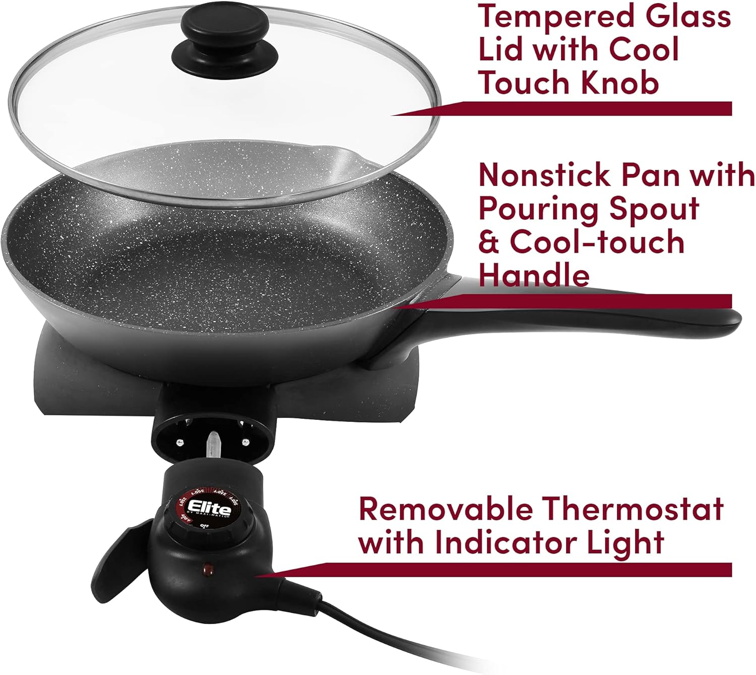 - SAFETY TESTED ETL listed 1000-1200 Watt/120V electric skillet is ideal for home kitchen use. The Elite Gourmet Nonstick Fry Pan Electric Skillet includes Base with Pour Spout, Removable Thermostat, Tempered Glass Lid and Instruction Manual with Recipes!