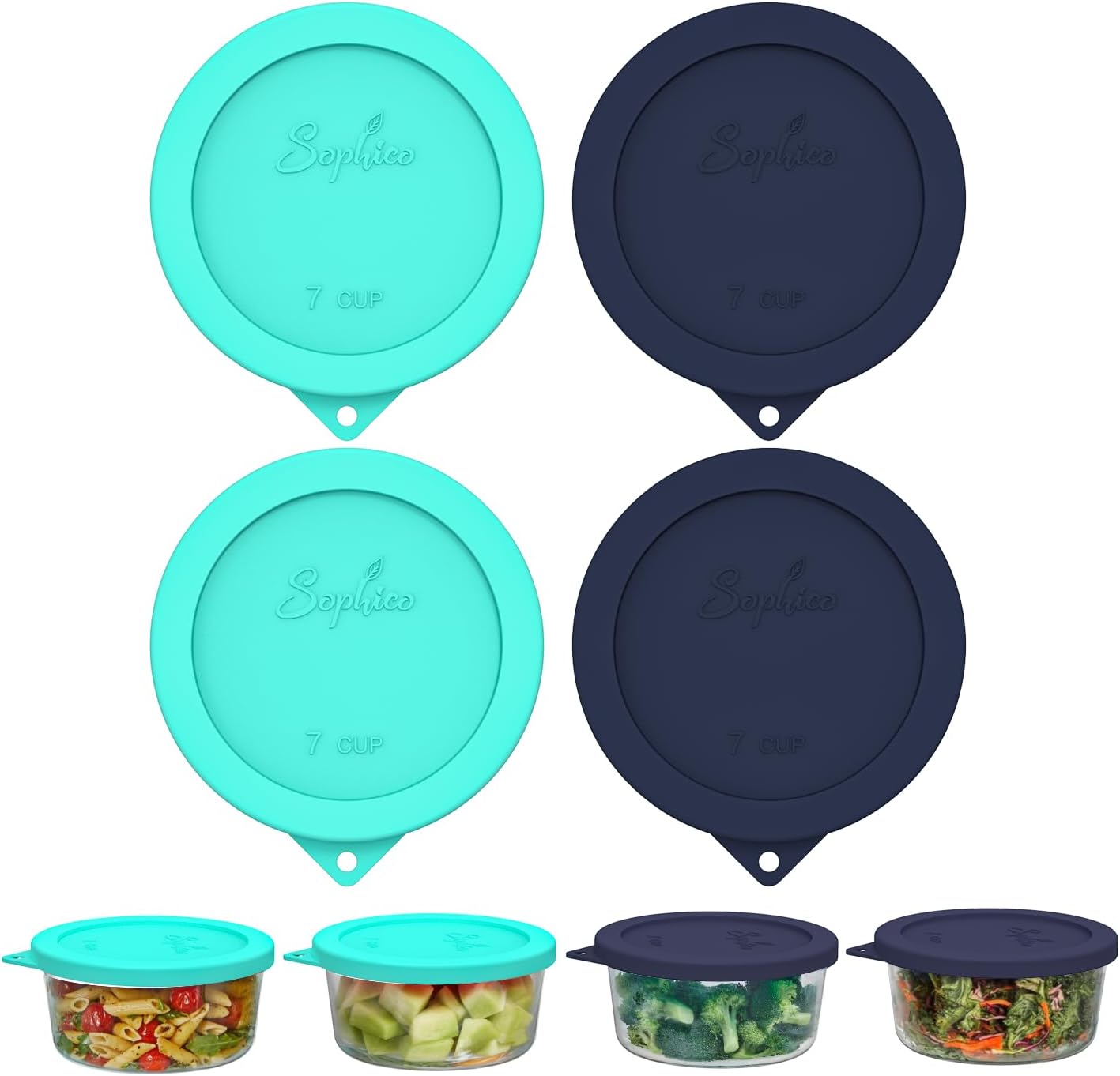 Sophico Sophico Round Silicone Storage Cover Lids Replacement for Anchor Hocking and Pyrex 7402-PC 6/7 Cup Glass Bowls (Container not Included) (Mint-Navy blue, 4pack)