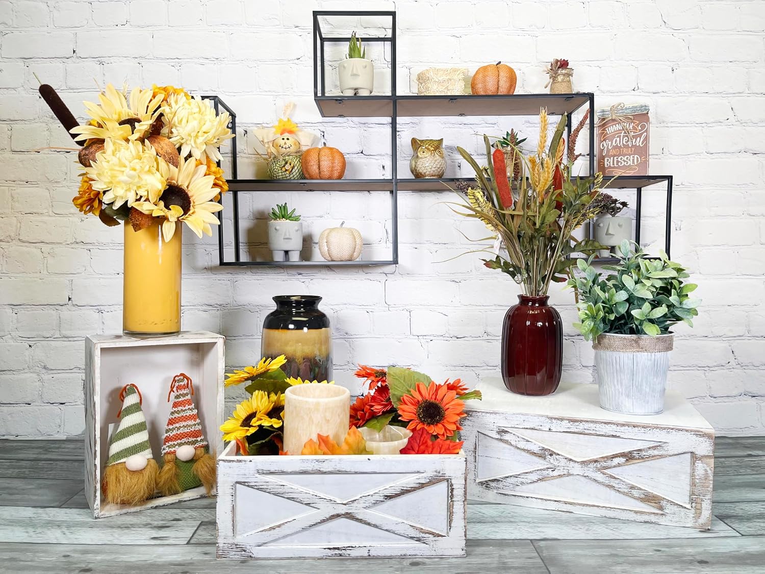 - [Beautiful Design] Set of 3 NEW wooden crates are 100% uniquely handcrafted. Distressed rustic white wooden crates finish adds a charming farmhouse vintage touch. Each wood crate has cut-in handles, offering a strong hold and ease to carry. Study and light weight.