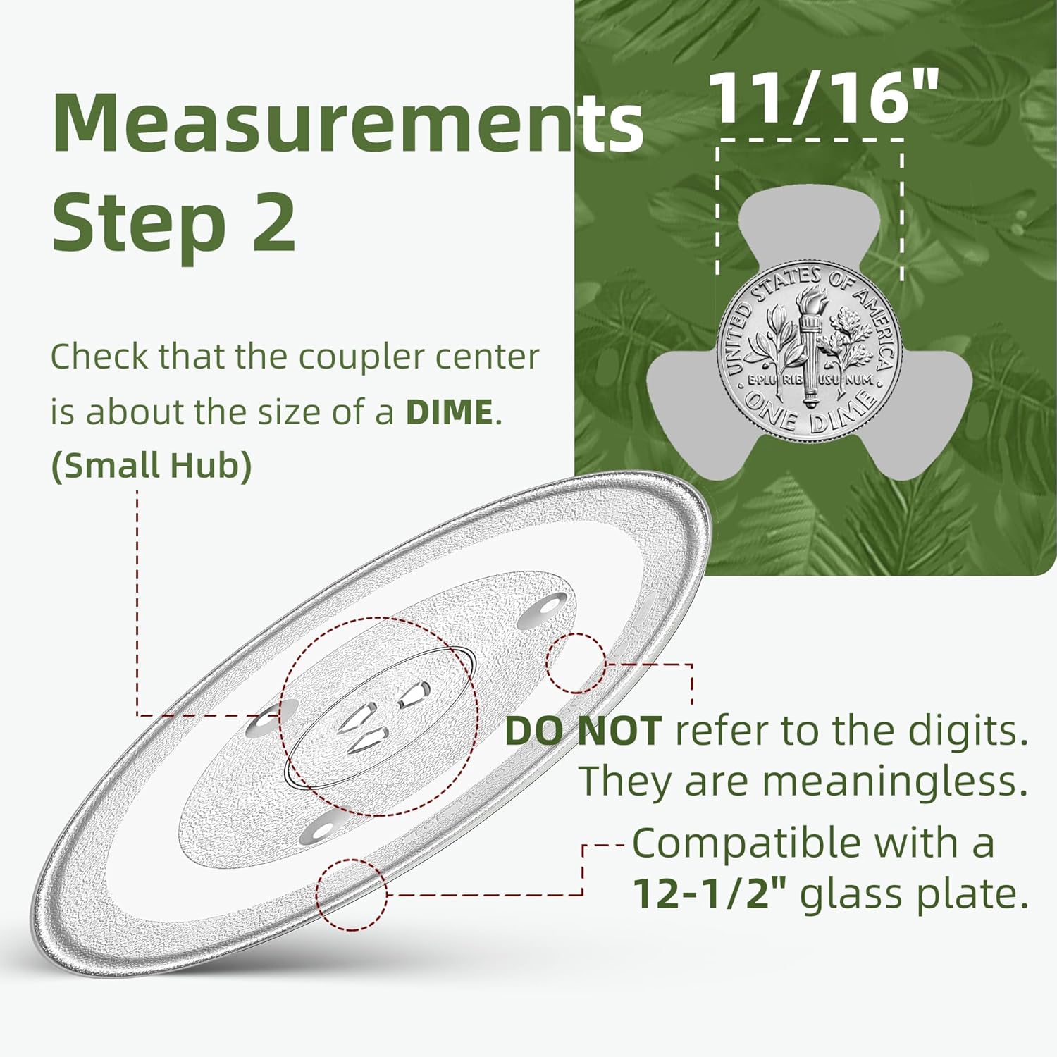 - This 12.5 IN Microwave Glass Turntable has a one-dime sized small coupler hole in the center. (The center spot of turntable coupler measures 11/16" in diameter)
