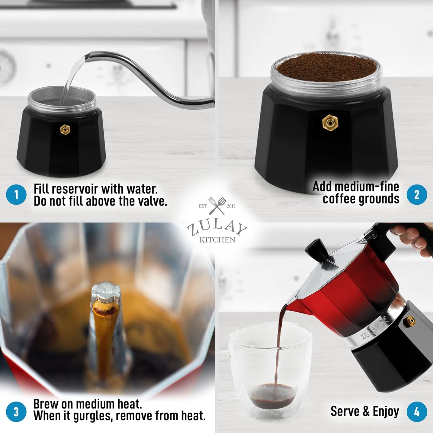 - PREMIUM QUALITY DESIGN: Crafted with a durable, food-grade cast aluminum body, the classic Italian design of this espresso maker ensures quick and even heat distribution for a rich and velvety coffee flavor. The built-in safety valve regulates pressure inside the coffee pot for higher caffeine extraction. This Italian espresso maker is designed with a heat-resistant handle, lid knob, and a built-in spout for easy pouring.