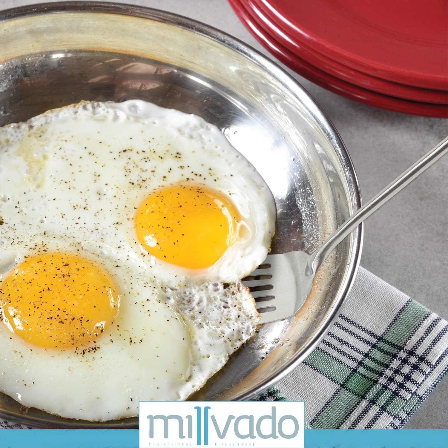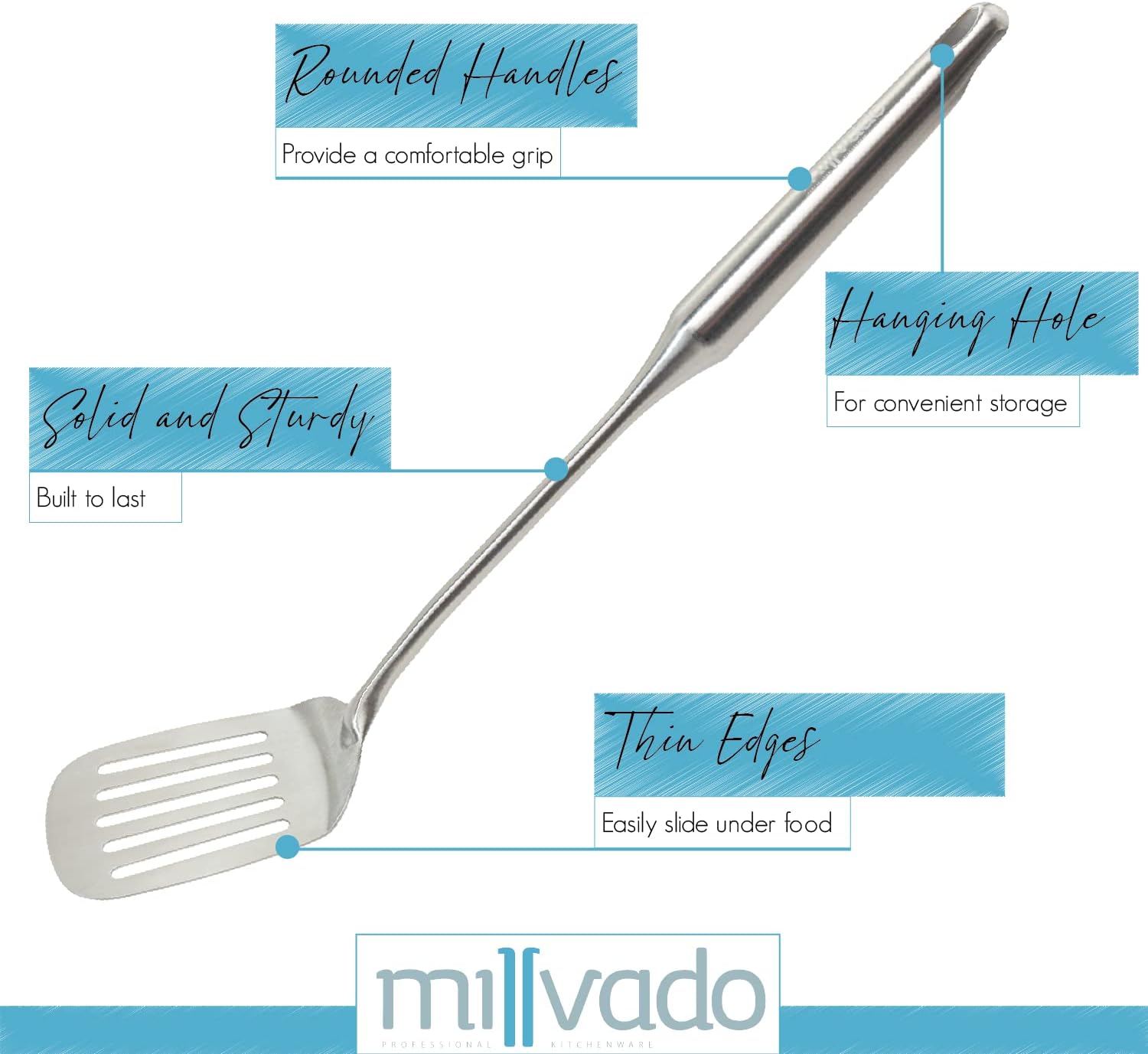 • THIN, YET STURDY: This stainless-steel spatula has a thin enough edge to easily slide under pancakes, omelets, or the like, yet it’s sturdy and will provide long-lasting durability. It has an ergonomic rounded handle, too, which won't cut into your hand while using. It's one of those spatulas you'll be glad you added to your kitchen tools collection!