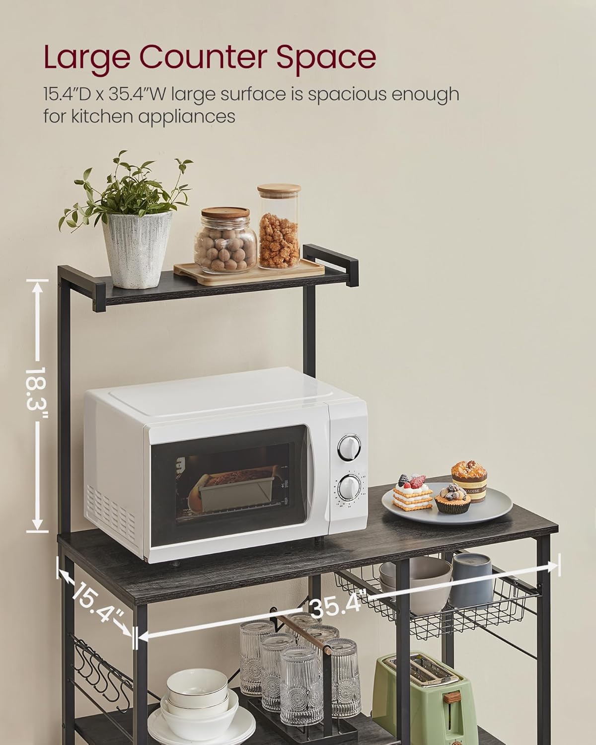 VASAGLE Baker's Rack, Microwave Stand, Kitchen Storage Rack with Wire Basket, 6 Hooks, and Shelves, for Spices, Pots, and Pans, Charcoal Gray and Ink Black UKKS035B04