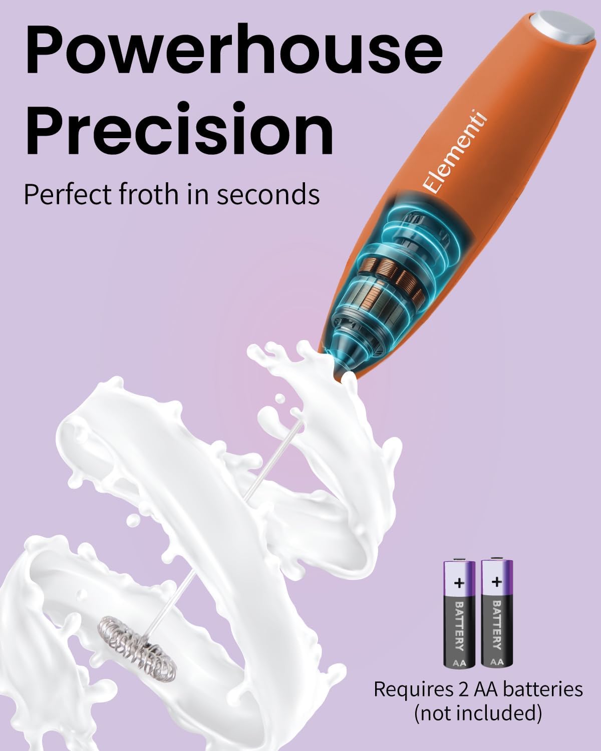 Elementi Portable Milk Frother & Stand – Compact Mixer for Powdered Drinks and Coffee, Electric Whisk Hand Blender, Specialty Kitchen Appliance (Pumpkin Orange)