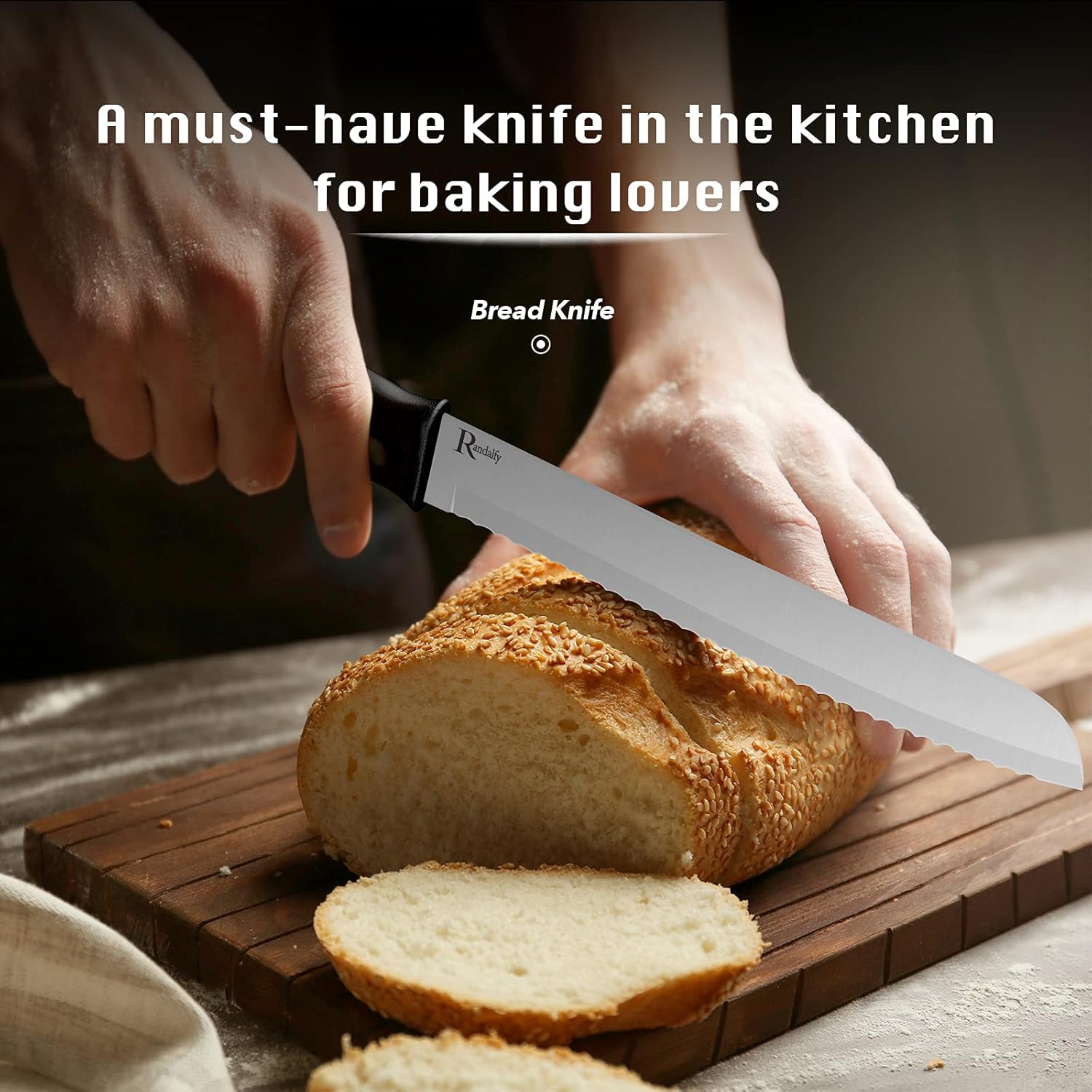- ALL-in-ONE PERFECT SET: 7 pieces kitchen knife set includes: 8" Chef Knife, 8" Bread Knife, 7" Santoku Knife, 5" Utility Knife, 3.5" Paring Knife, Kitchen Scissors, PE kitchen knife block. Knife block won't take up a lot of space and keeps your kitchen orderly. Randalfy 7 pieces kitchen knife set with block is suitable for all your cutting tasks.