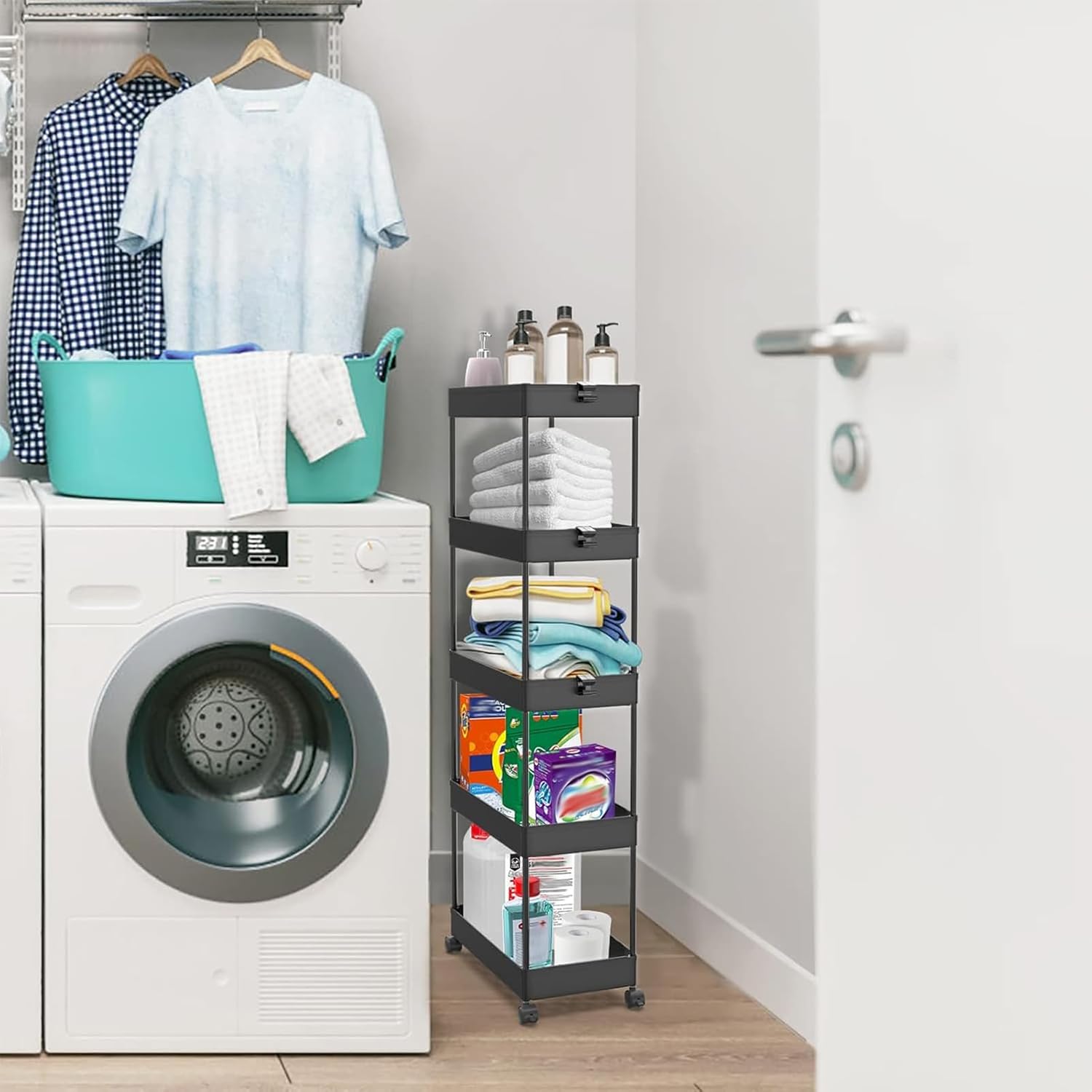 - 【Flexible Storage Cart】- The 5-tier Rolling storage utility cart is 8.66 in design which can be used in tight spaces in your home for storage. Suitable for closets, kitchens, bathrooms, garages, laundry rooms, offices.