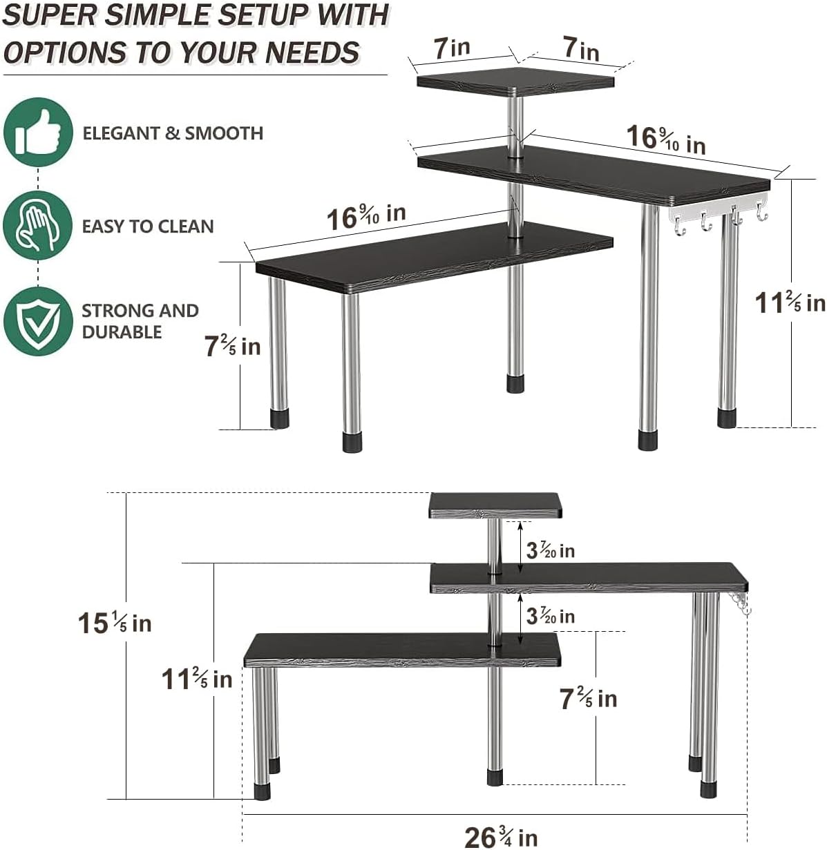 • STYLISH DESIGN: The black bathroom countertop organizer designed to fit into corners and make better use of every inch of valuable counter space; adjustable position of each tier and freestanding design makes it easy to move where more storage is needed.
