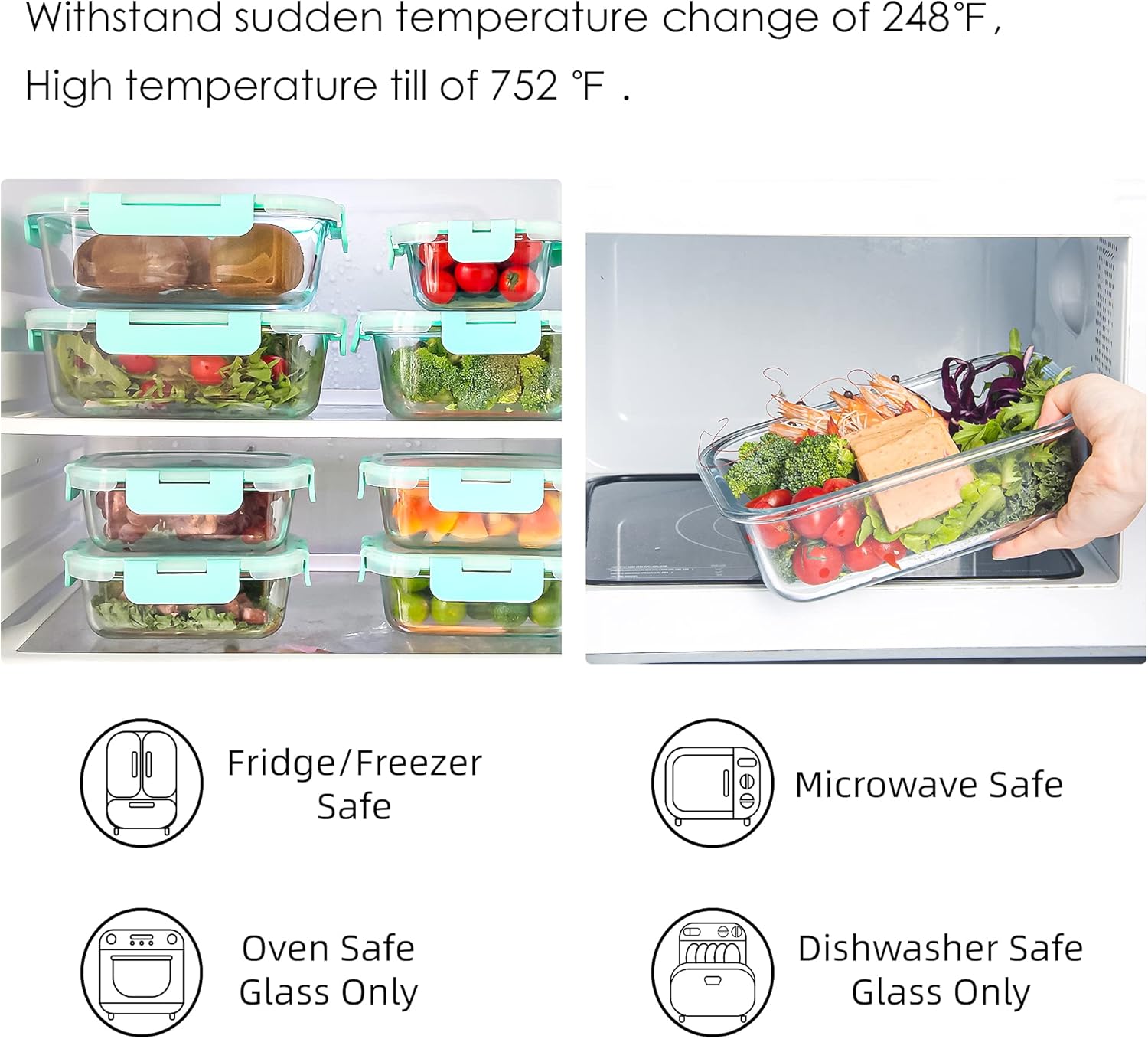 - Made from borosilicate glass and BPA-free plastic lids, withstands high heat and sudden temperature changes